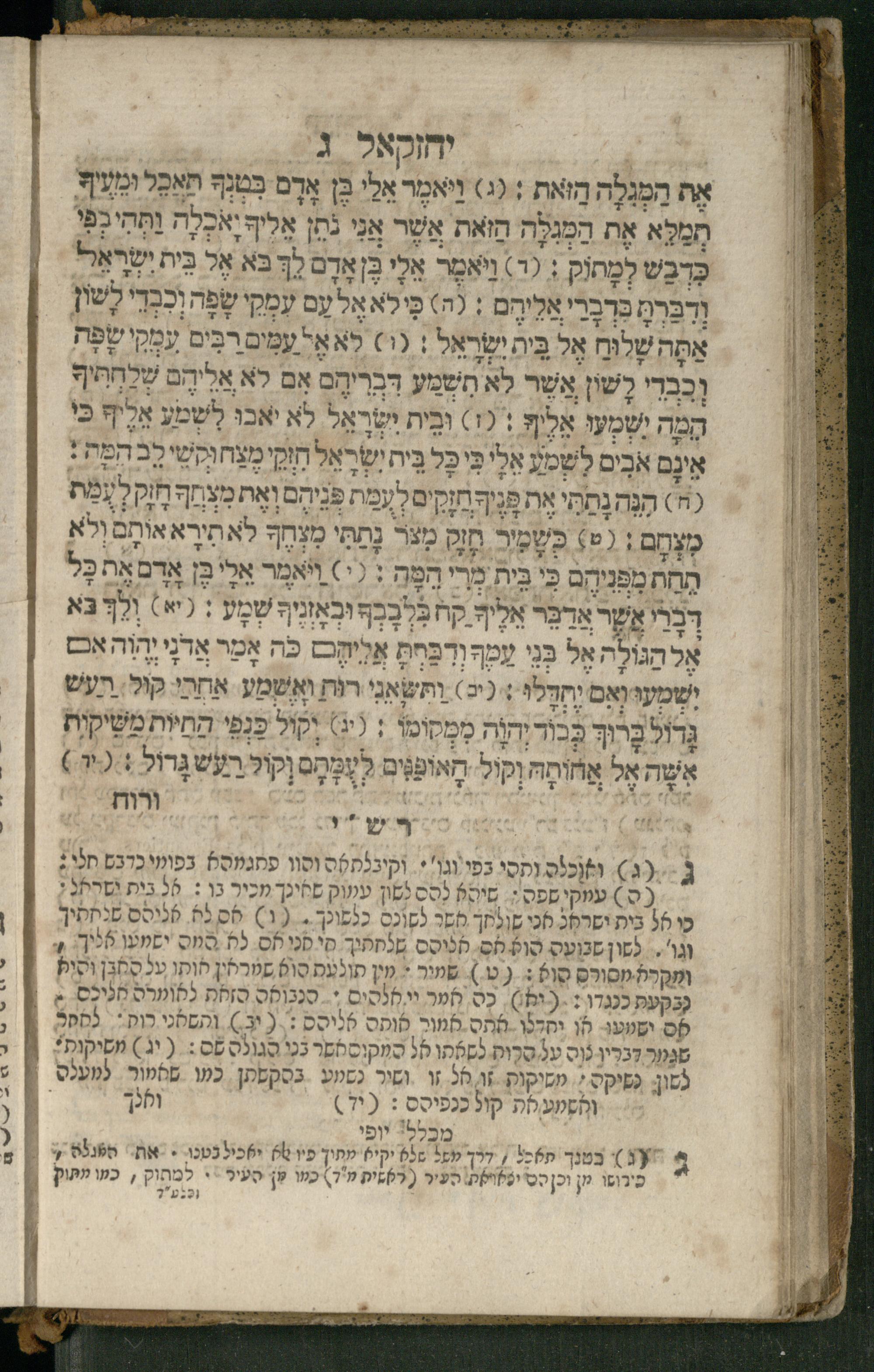Ṿe-hu Sefer Yeḥezḳel / meturgam Ashkenazit u-mevoʾar, gam hitsagti bo perush ... Rashi z.ts.l. ... Ṿe-nilṿeh elaṿ perush Mikhlal yofi ...והוא ספר יחזקאל / מתורגם אשכנזית ומבואר, גם הצגתי בו פירוש ... רש״י זצ״ל ... ונלוה אליו פירוש מכלל יופי ...