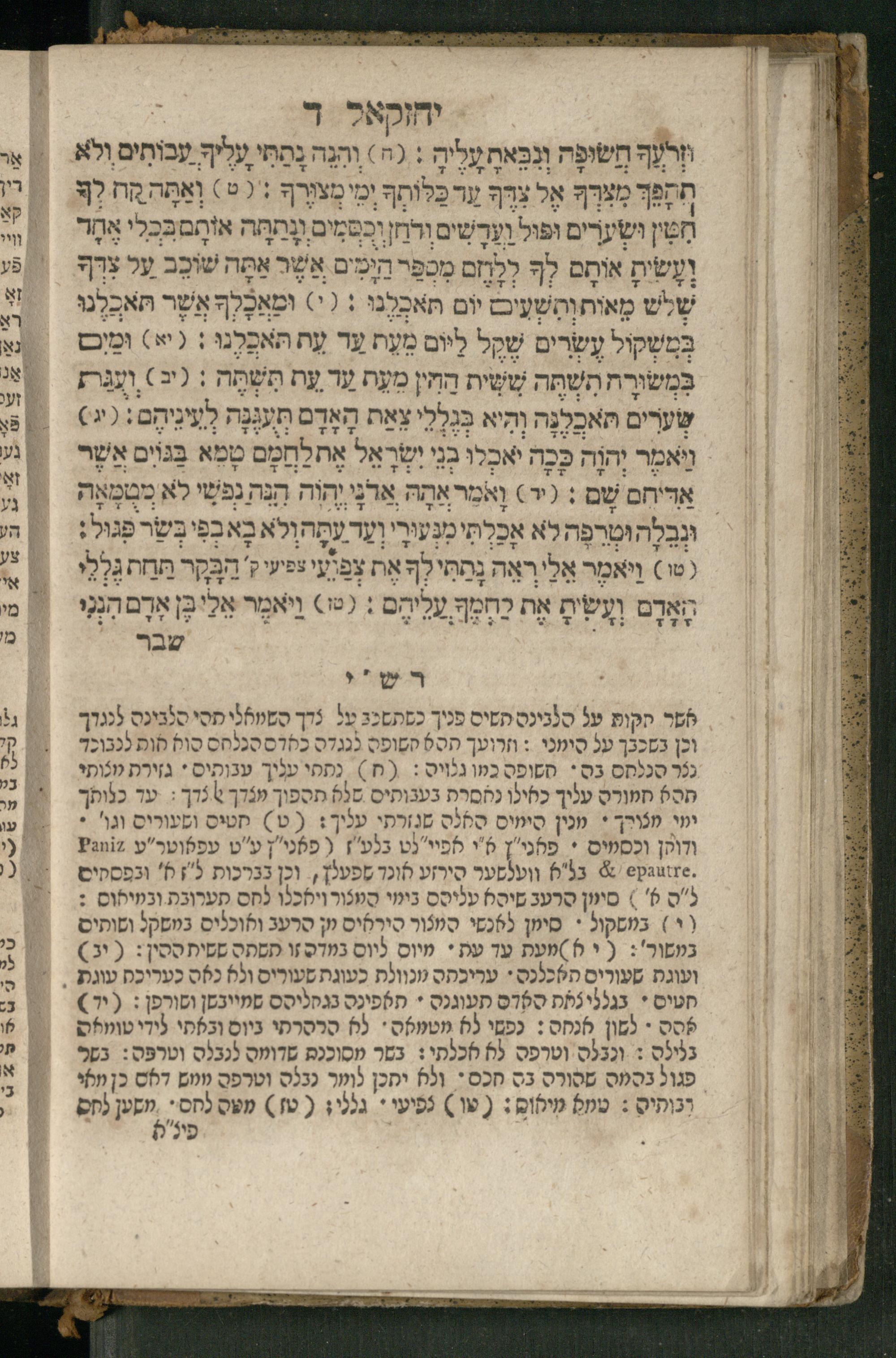 Ṿe-hu Sefer Yeḥezḳel / meturgam Ashkenazit u-mevoʾar, gam hitsagti bo perush ... Rashi z.ts.l. ... Ṿe-nilṿeh elaṿ perush Mikhlal yofi ...והוא ספר יחזקאל / מתורגם אשכנזית ומבואר, גם הצגתי בו פירוש ... רש״י זצ״ל ... ונלוה אליו פירוש מכלל יופי ...