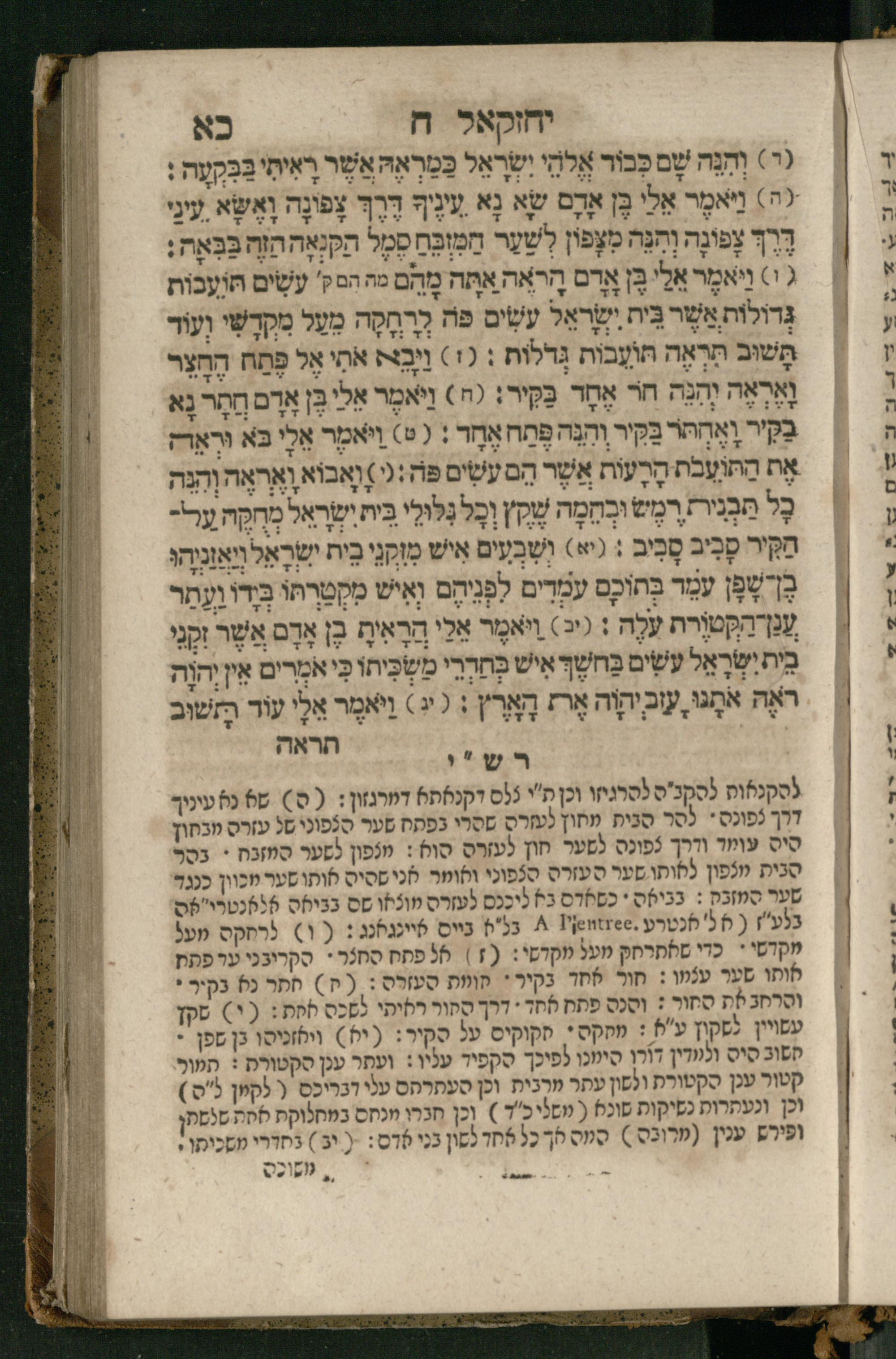 Ṿe-hu Sefer Yeḥezḳel / meturgam Ashkenazit u-mevoʾar, gam hitsagti bo perush ... Rashi z.ts.l. ... Ṿe-nilṿeh elaṿ perush Mikhlal yofi ...והוא ספר יחזקאל / מתורגם אשכנזית ומבואר, גם הצגתי בו פירוש ... רש״י זצ״ל ... ונלוה אליו פירוש מכלל יופי ...