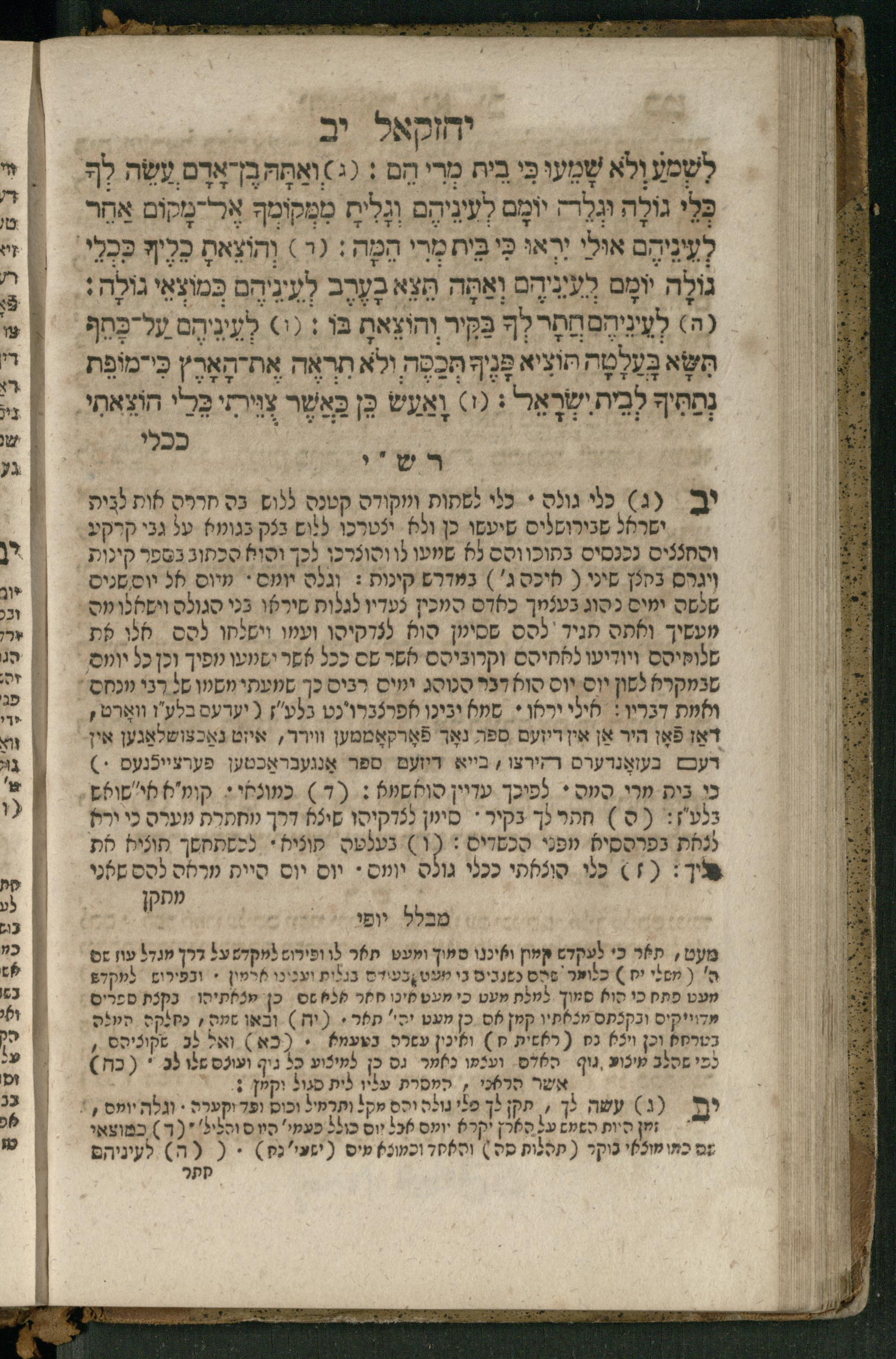 Ṿe-hu Sefer Yeḥezḳel / meturgam Ashkenazit u-mevoʾar, gam hitsagti bo perush ... Rashi z.ts.l. ... Ṿe-nilṿeh elaṿ perush Mikhlal yofi ...והוא ספר יחזקאל / מתורגם אשכנזית ומבואר, גם הצגתי בו פירוש ... רש״י זצ״ל ... ונלוה אליו פירוש מכלל יופי ...