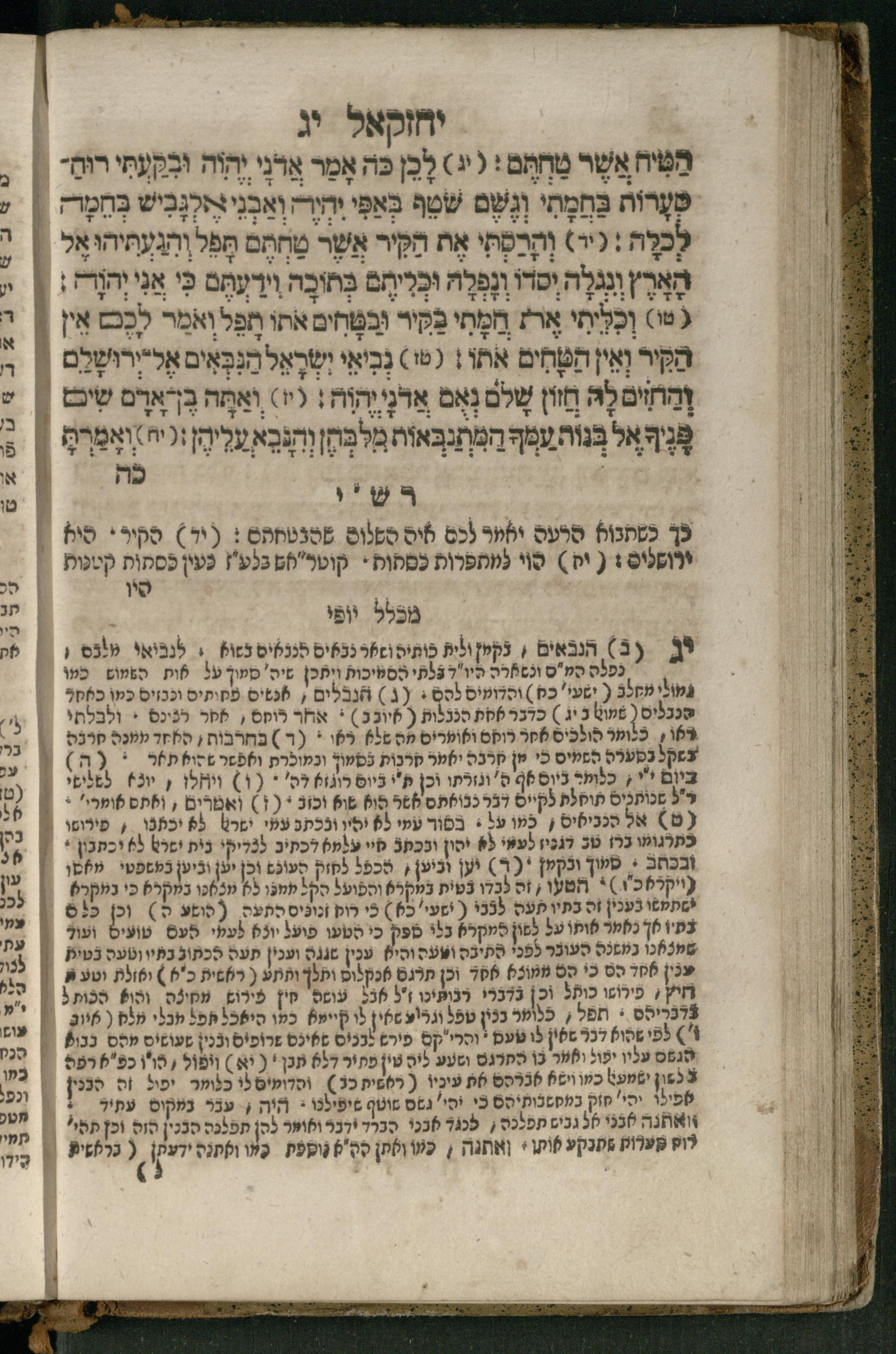 Ṿe-hu Sefer Yeḥezḳel / meturgam Ashkenazit u-mevoʾar, gam hitsagti bo perush ... Rashi z.ts.l. ... Ṿe-nilṿeh elaṿ perush Mikhlal yofi ...והוא ספר יחזקאל / מתורגם אשכנזית ומבואר, גם הצגתי בו פירוש ... רש״י זצ״ל ... ונלוה אליו פירוש מכלל יופי ...