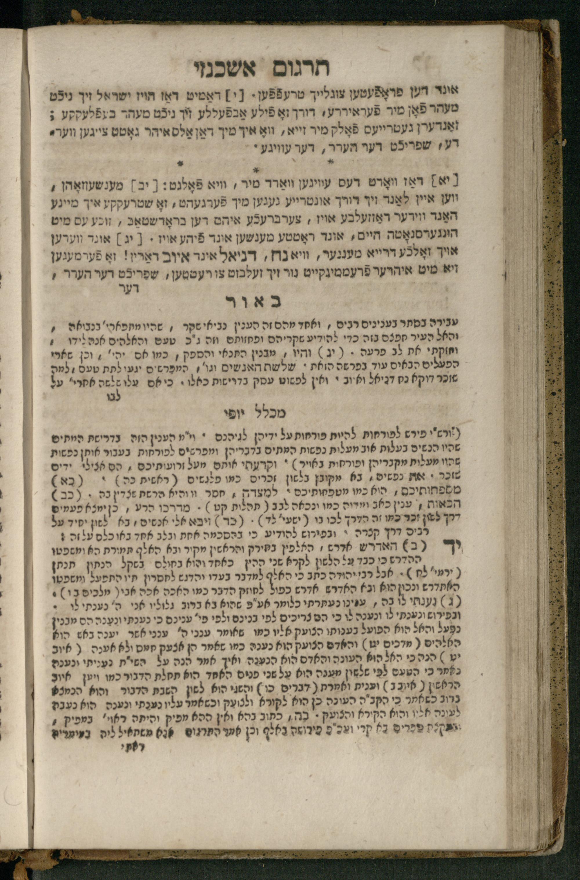 Ṿe-hu Sefer Yeḥezḳel / meturgam Ashkenazit u-mevoʾar, gam hitsagti bo perush ... Rashi z.ts.l. ... Ṿe-nilṿeh elaṿ perush Mikhlal yofi ...והוא ספר יחזקאל / מתורגם אשכנזית ומבואר, גם הצגתי בו פירוש ... רש״י זצ״ל ... ונלוה אליו פירוש מכלל יופי ...