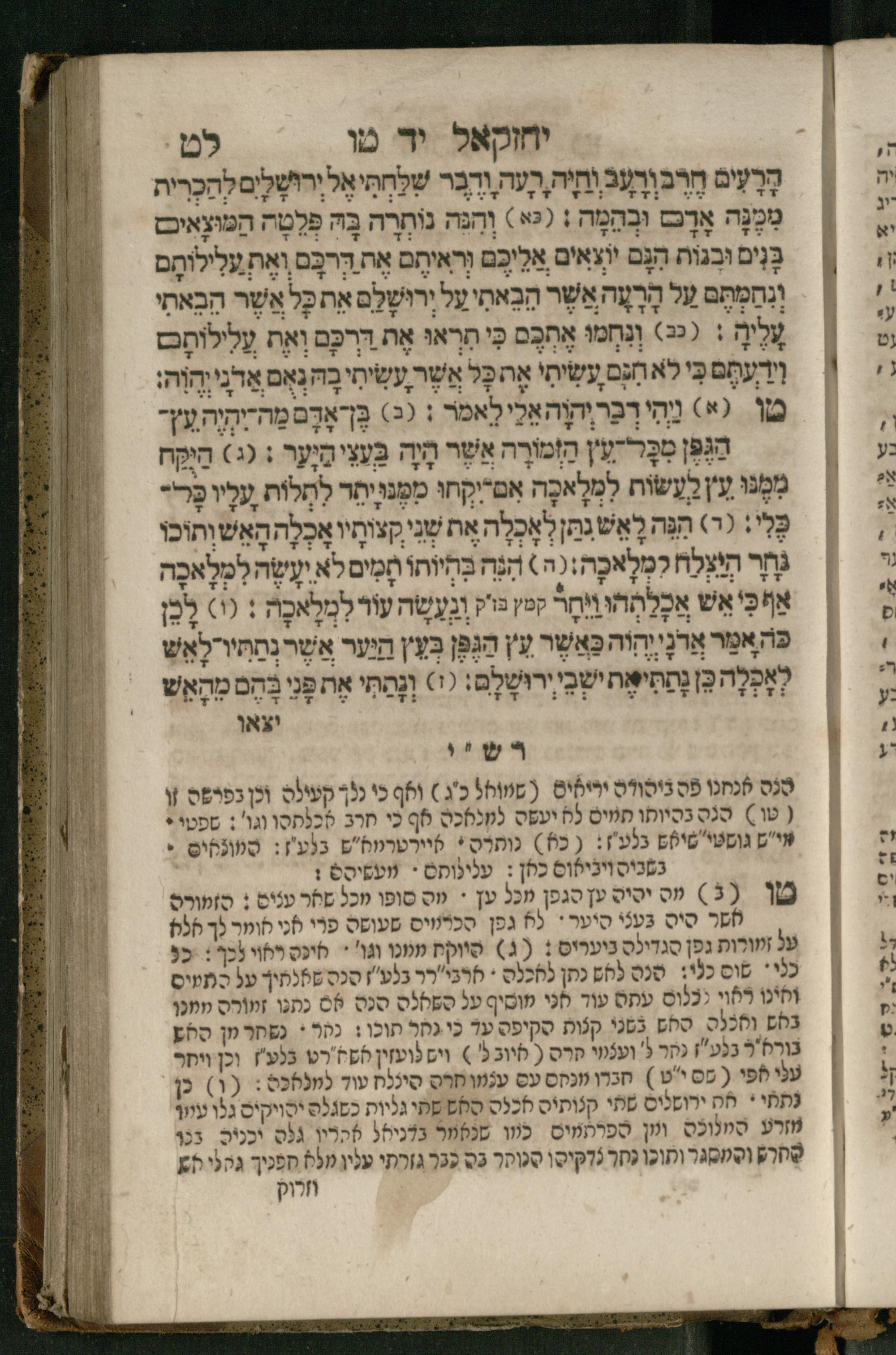Ṿe-hu Sefer Yeḥezḳel / meturgam Ashkenazit u-mevoʾar, gam hitsagti bo perush ... Rashi z.ts.l. ... Ṿe-nilṿeh elaṿ perush Mikhlal yofi ...והוא ספר יחזקאל / מתורגם אשכנזית ומבואר, גם הצגתי בו פירוש ... רש״י זצ״ל ... ונלוה אליו פירוש מכלל יופי ...