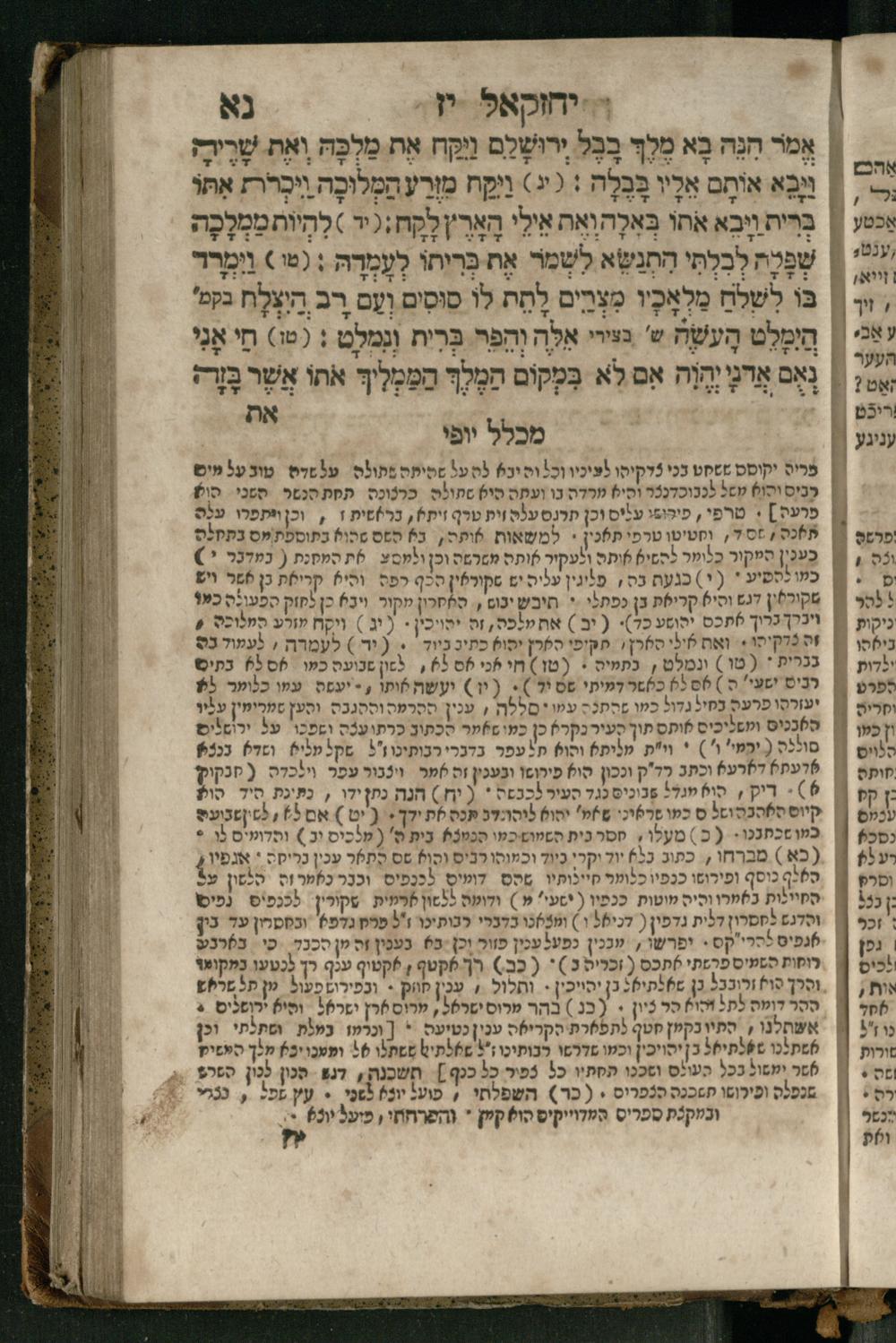 Ṿe-hu Sefer Yeḥezḳel / meturgam Ashkenazit u-mevoʾar, gam hitsagti bo perush ... Rashi z.ts.l. ... Ṿe-nilṿeh elaṿ perush Mikhlal yofi ...והוא ספר יחזקאל / מתורגם אשכנזית ומבואר, גם הצגתי בו פירוש ... רש״י זצ״ל ... ונלוה אליו פירוש מכלל יופי ...