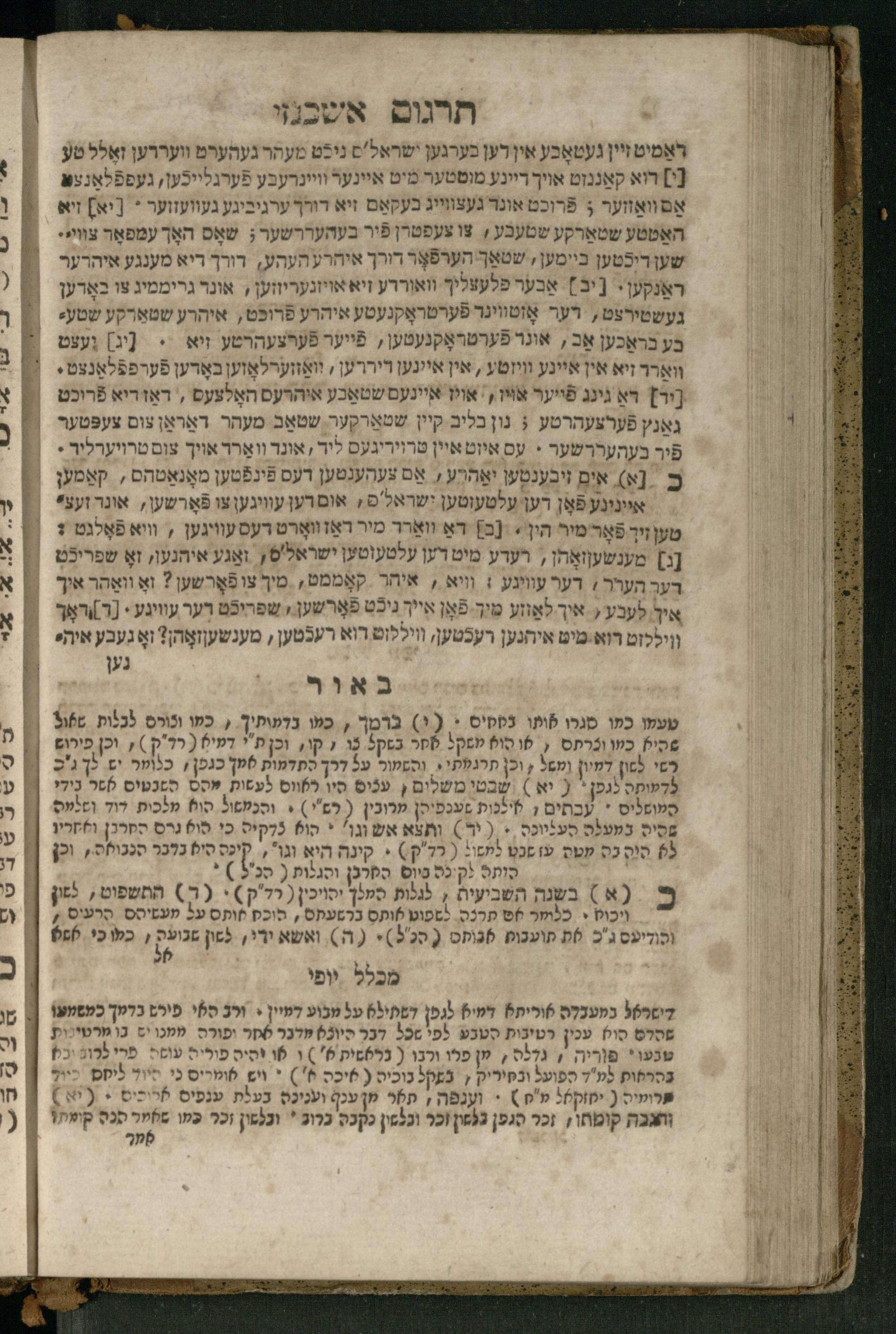 Ṿe-hu Sefer Yeḥezḳel / meturgam Ashkenazit u-mevoʾar, gam hitsagti bo perush ... Rashi z.ts.l. ... Ṿe-nilṿeh elaṿ perush Mikhlal yofi ...והוא ספר יחזקאל / מתורגם אשכנזית ומבואר, גם הצגתי בו פירוש ... רש״י זצ״ל ... ונלוה אליו פירוש מכלל יופי ...