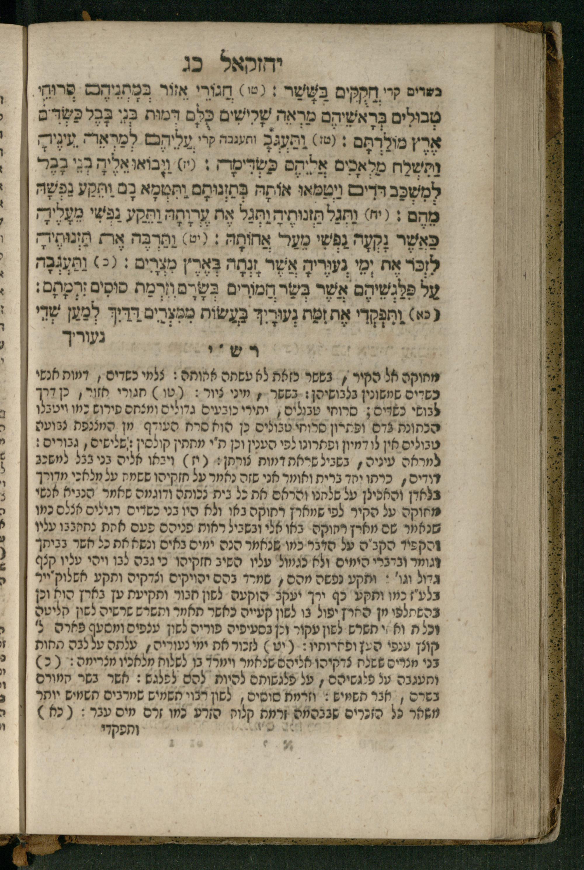 Ṿe-hu Sefer Yeḥezḳel / meturgam Ashkenazit u-mevoʾar, gam hitsagti bo perush ... Rashi z.ts.l. ... Ṿe-nilṿeh elaṿ perush Mikhlal yofi ...והוא ספר יחזקאל / מתורגם אשכנזית ומבואר, גם הצגתי בו פירוש ... רש״י זצ״ל ... ונלוה אליו פירוש מכלל יופי ...