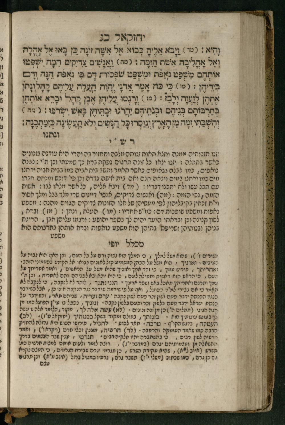 Ṿe-hu Sefer Yeḥezḳel / meturgam Ashkenazit u-mevoʾar, gam hitsagti bo perush ... Rashi z.ts.l. ... Ṿe-nilṿeh elaṿ perush Mikhlal yofi ...והוא ספר יחזקאל / מתורגם אשכנזית ומבואר, גם הצגתי בו פירוש ... רש״י זצ״ל ... ונלוה אליו פירוש מכלל יופי ...