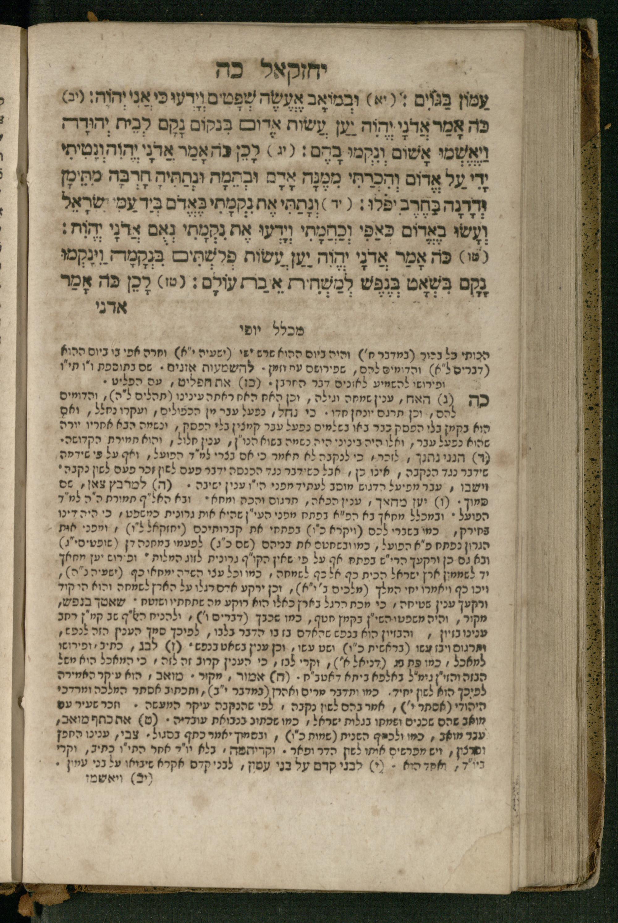 Ṿe-hu Sefer Yeḥezḳel / meturgam Ashkenazit u-mevoʾar, gam hitsagti bo perush ... Rashi z.ts.l. ... Ṿe-nilṿeh elaṿ perush Mikhlal yofi ...והוא ספר יחזקאל / מתורגם אשכנזית ומבואר, גם הצגתי בו פירוש ... רש״י זצ״ל ... ונלוה אליו פירוש מכלל יופי ...