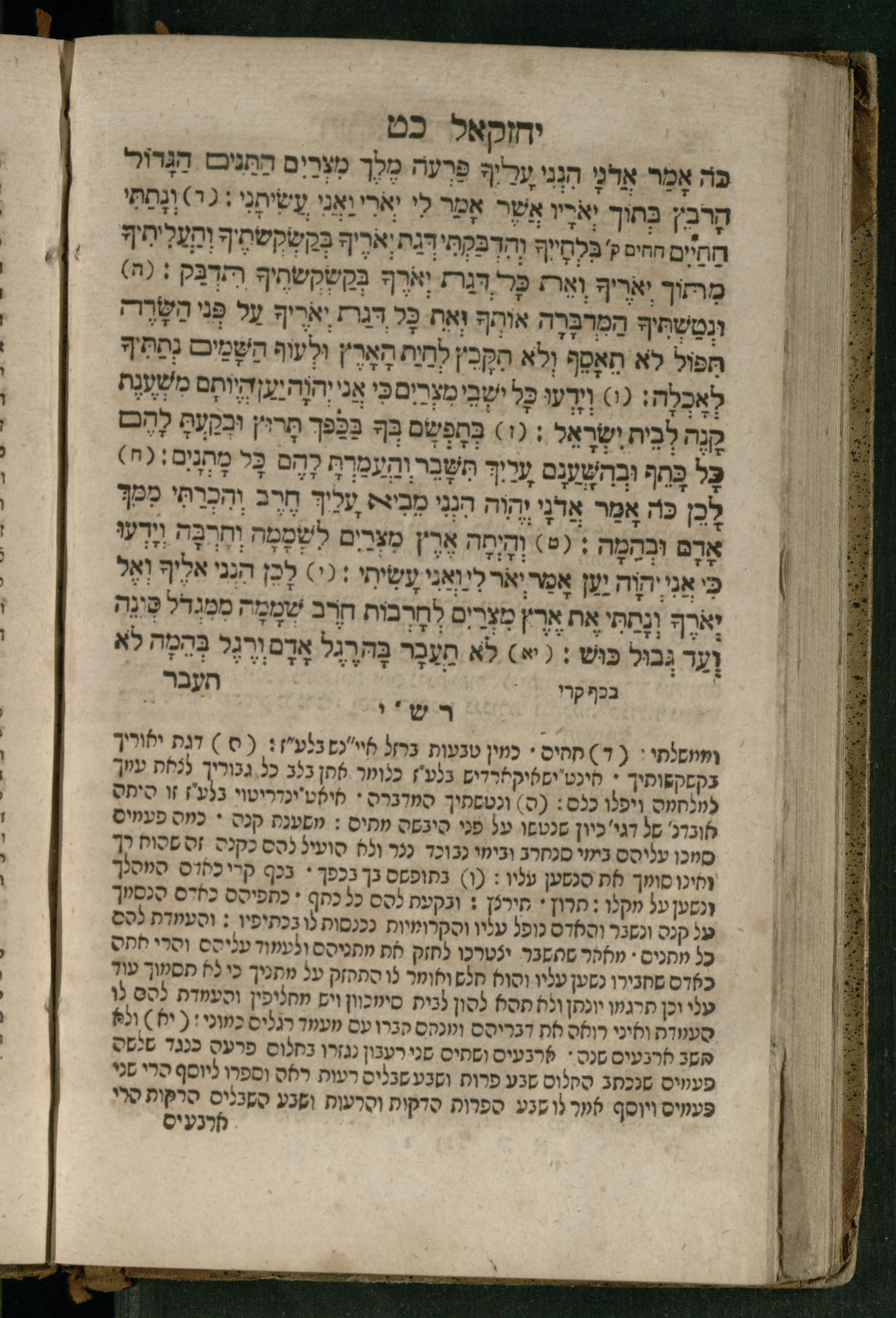 Ṿe-hu Sefer Yeḥezḳel / meturgam Ashkenazit u-mevoʾar, gam hitsagti bo perush ... Rashi z.ts.l. ... Ṿe-nilṿeh elaṿ perush Mikhlal yofi ...והוא ספר יחזקאל / מתורגם אשכנזית ומבואר, גם הצגתי בו פירוש ... רש״י זצ״ל ... ונלוה אליו פירוש מכלל יופי ...