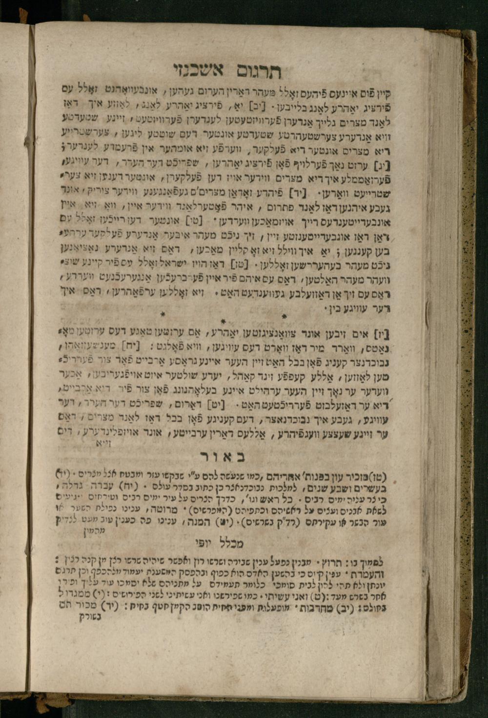 Ṿe-hu Sefer Yeḥezḳel / meturgam Ashkenazit u-mevoʾar, gam hitsagti bo perush ... Rashi z.ts.l. ... Ṿe-nilṿeh elaṿ perush Mikhlal yofi ...והוא ספר יחזקאל / מתורגם אשכנזית ומבואר, גם הצגתי בו פירוש ... רש״י זצ״ל ... ונלוה אליו פירוש מכלל יופי ...