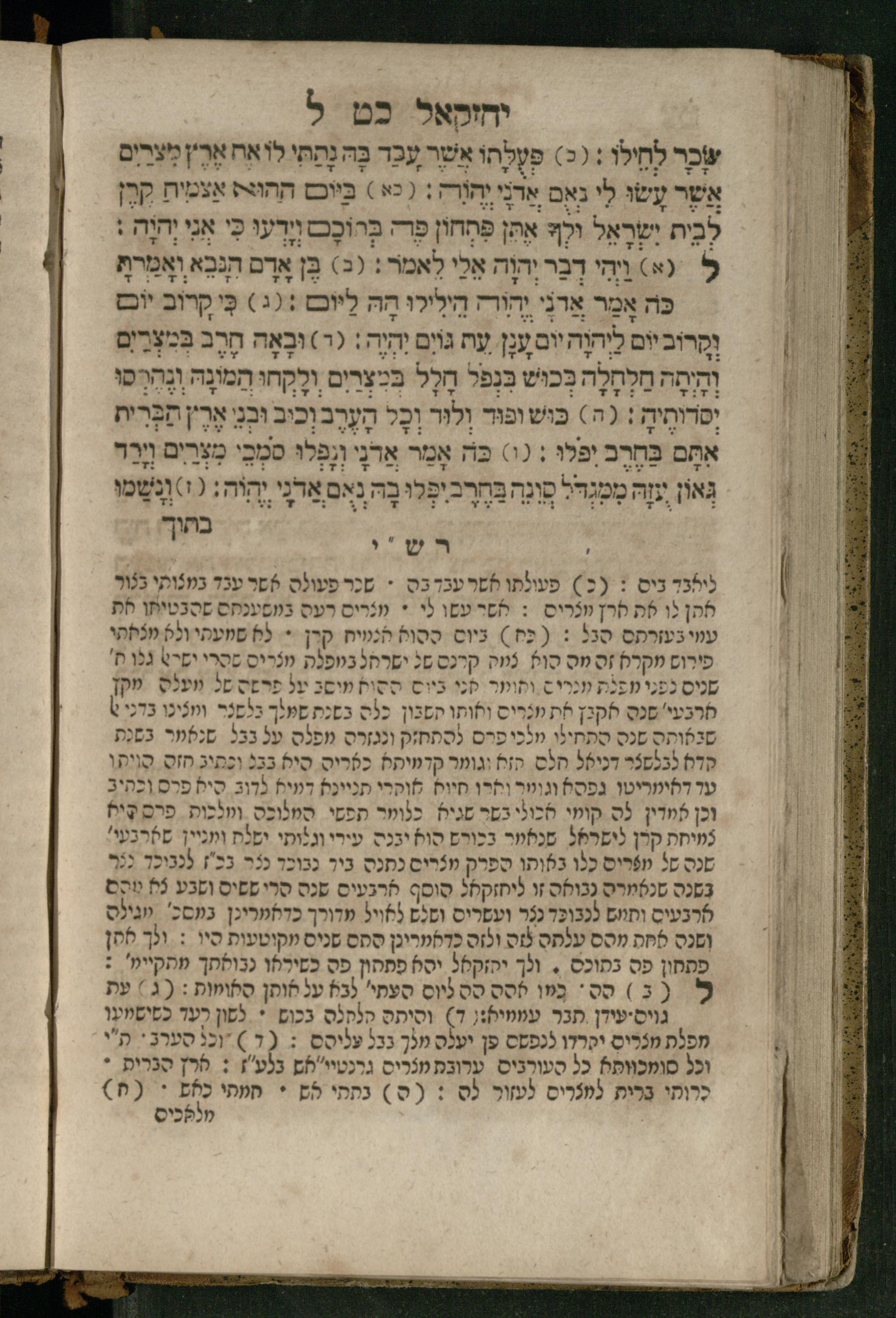 Ṿe-hu Sefer Yeḥezḳel / meturgam Ashkenazit u-mevoʾar, gam hitsagti bo perush ... Rashi z.ts.l. ... Ṿe-nilṿeh elaṿ perush Mikhlal yofi ...והוא ספר יחזקאל / מתורגם אשכנזית ומבואר, גם הצגתי בו פירוש ... רש״י זצ״ל ... ונלוה אליו פירוש מכלל יופי ...