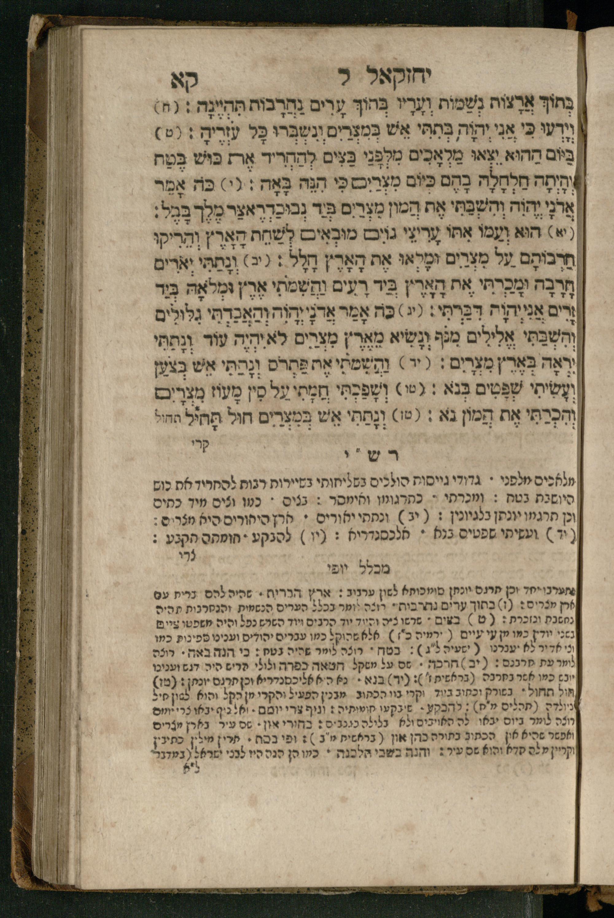 Ṿe-hu Sefer Yeḥezḳel / meturgam Ashkenazit u-mevoʾar, gam hitsagti bo perush ... Rashi z.ts.l. ... Ṿe-nilṿeh elaṿ perush Mikhlal yofi ...והוא ספר יחזקאל / מתורגם אשכנזית ומבואר, גם הצגתי בו פירוש ... רש״י זצ״ל ... ונלוה אליו פירוש מכלל יופי ...