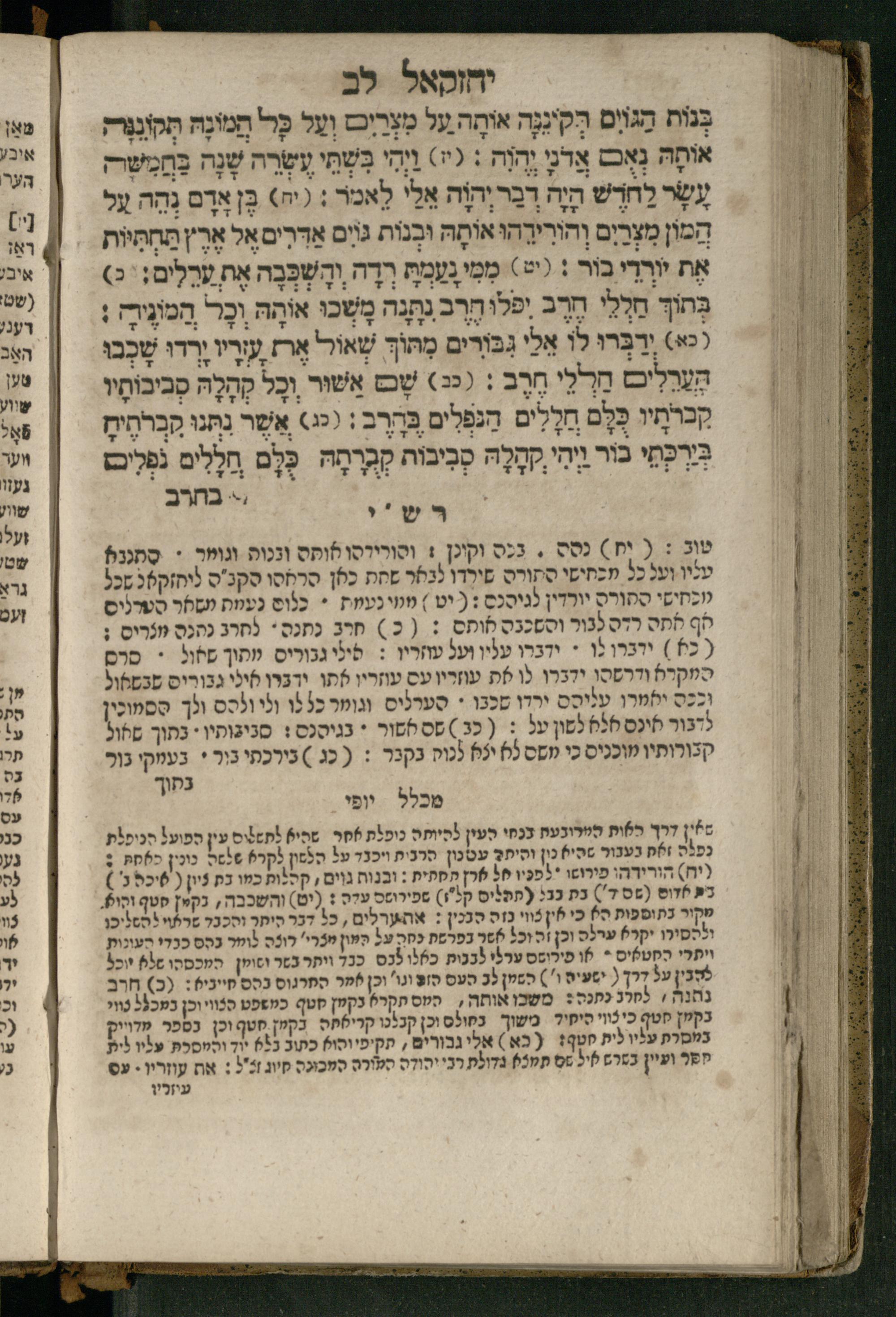 Ṿe-hu Sefer Yeḥezḳel / meturgam Ashkenazit u-mevoʾar, gam hitsagti bo perush ... Rashi z.ts.l. ... Ṿe-nilṿeh elaṿ perush Mikhlal yofi ...והוא ספר יחזקאל / מתורגם אשכנזית ומבואר, גם הצגתי בו פירוש ... רש״י זצ״ל ... ונלוה אליו פירוש מכלל יופי ...