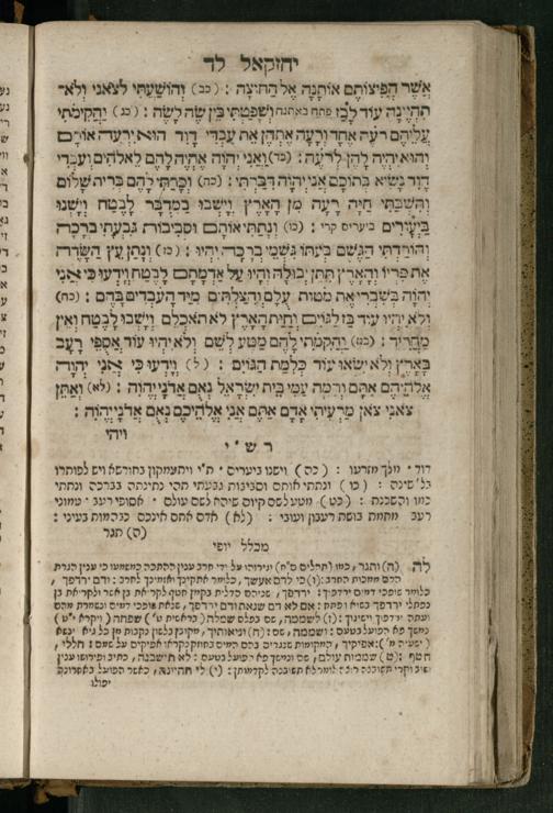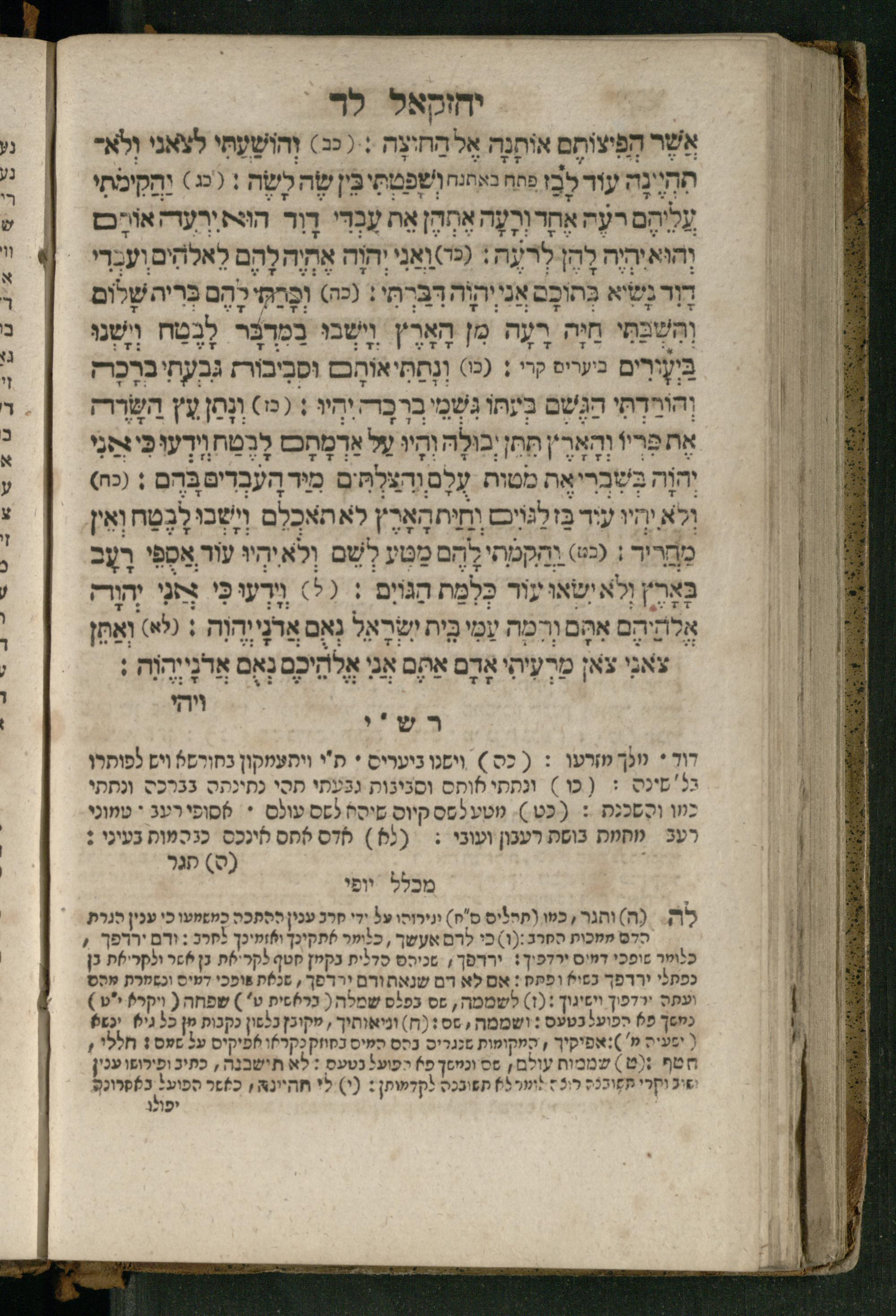 Ṿe-hu Sefer Yeḥezḳel / meturgam Ashkenazit u-mevoʾar, gam hitsagti bo perush ... Rashi z.ts.l. ... Ṿe-nilṿeh elaṿ perush Mikhlal yofi ...והוא ספר יחזקאל / מתורגם אשכנזית ומבואר, גם הצגתי בו פירוש ... רש״י זצ״ל ... ונלוה אליו פירוש מכלל יופי ...