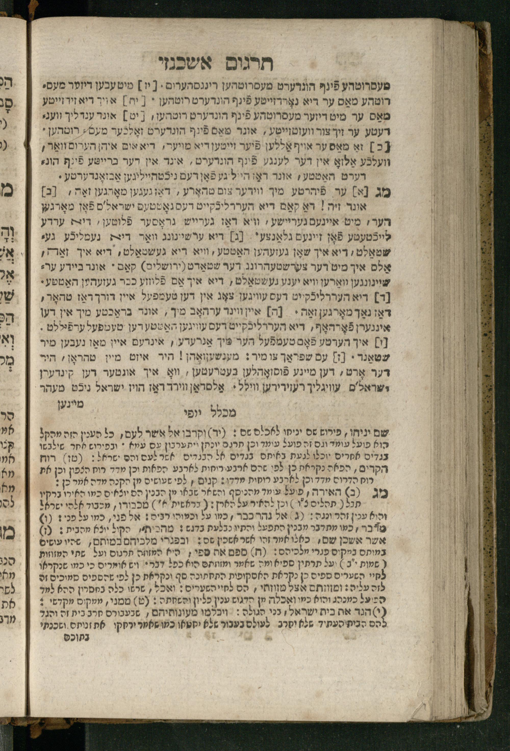 Ṿe-hu Sefer Yeḥezḳel / meturgam Ashkenazit u-mevoʾar, gam hitsagti bo perush ... Rashi z.ts.l. ... Ṿe-nilṿeh elaṿ perush Mikhlal yofi ...והוא ספר יחזקאל / מתורגם אשכנזית ומבואר, גם הצגתי בו פירוש ... רש״י זצ״ל ... ונלוה אליו פירוש מכלל יופי ...
