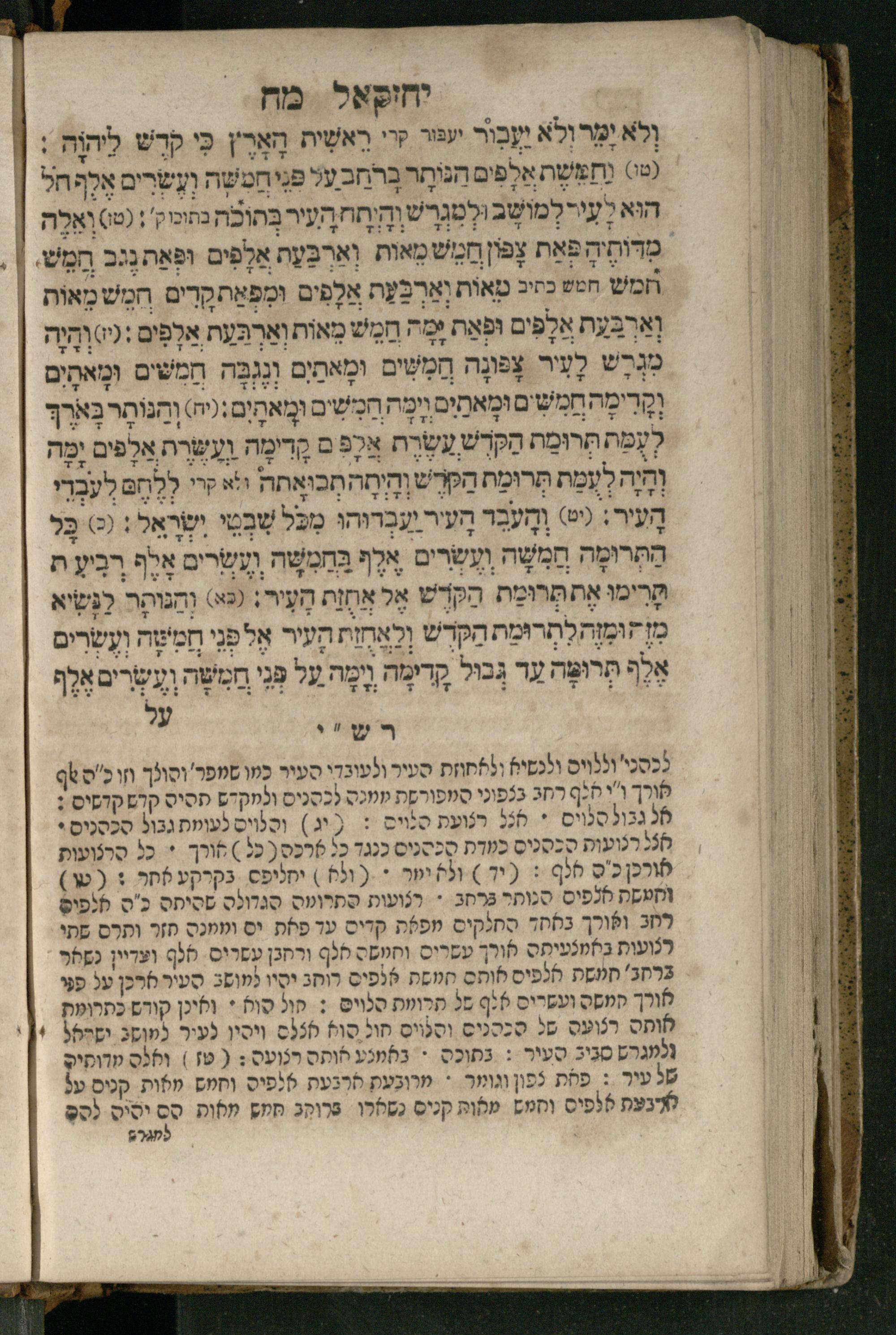 Ṿe-hu Sefer Yeḥezḳel / meturgam Ashkenazit u-mevoʾar, gam hitsagti bo perush ... Rashi z.ts.l. ... Ṿe-nilṿeh elaṿ perush Mikhlal yofi ...והוא ספר יחזקאל / מתורגם אשכנזית ומבואר, גם הצגתי בו פירוש ... רש״י זצ״ל ... ונלוה אליו פירוש מכלל יופי ...