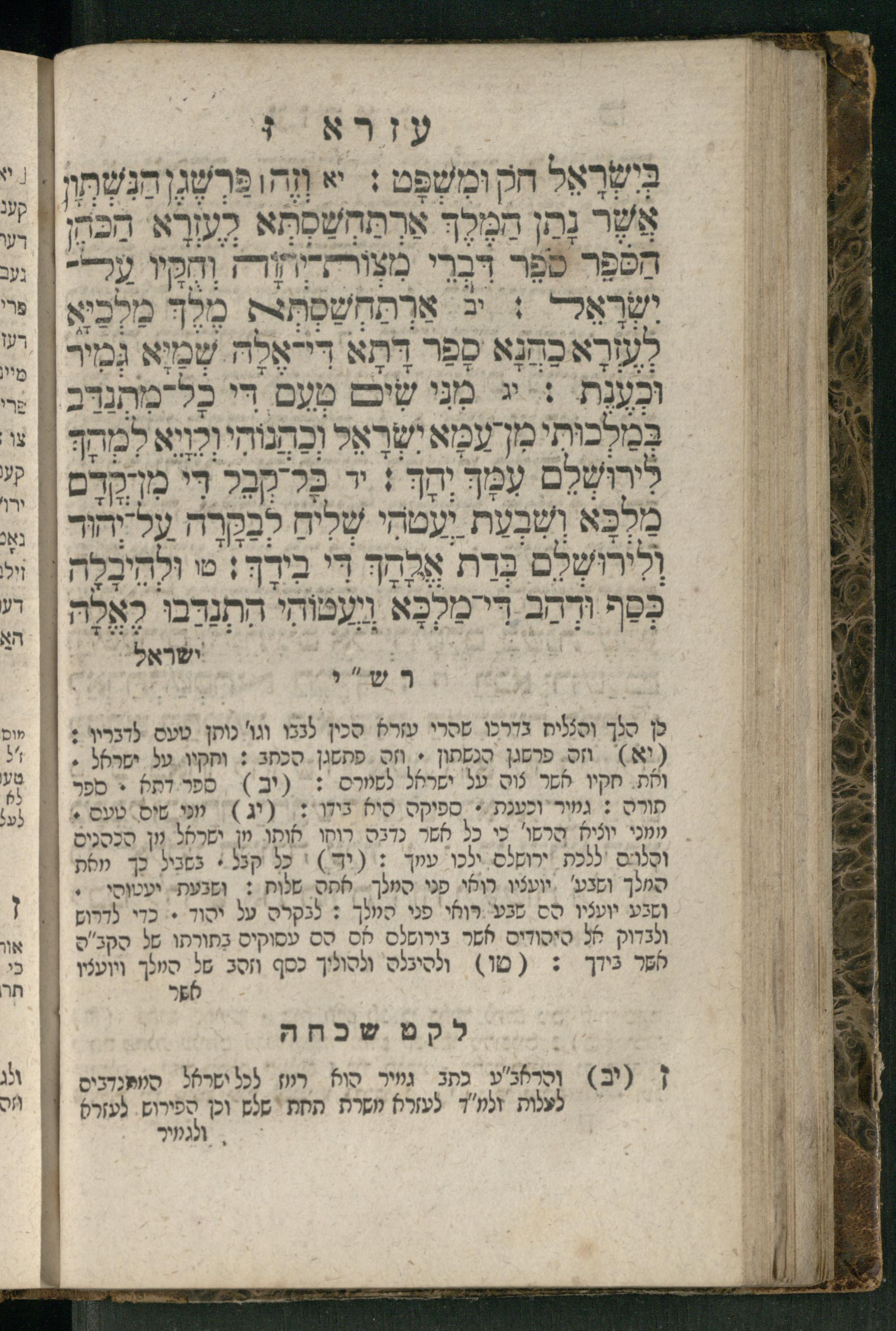 Sefer ʿEzra / miṭ iberzeṭtsung und biʾer fon Heyman Shṿabakher und Daṿid Oṭtenzoser, gam hitsagti bo perush ... Rashi z.ts.l., ṿe-nilṿeh elaṿ perush Mikhlal yofi ...ספר עזרא / מיט איבערזעטצונג אונד ביאור פאן היימאן שוואבאכער אונד דוד אטטענזאסער, גם הצגתי בו פירוש ... רש״י זצ״ל, ונלוה אליו פירוש מכלל יופי ...