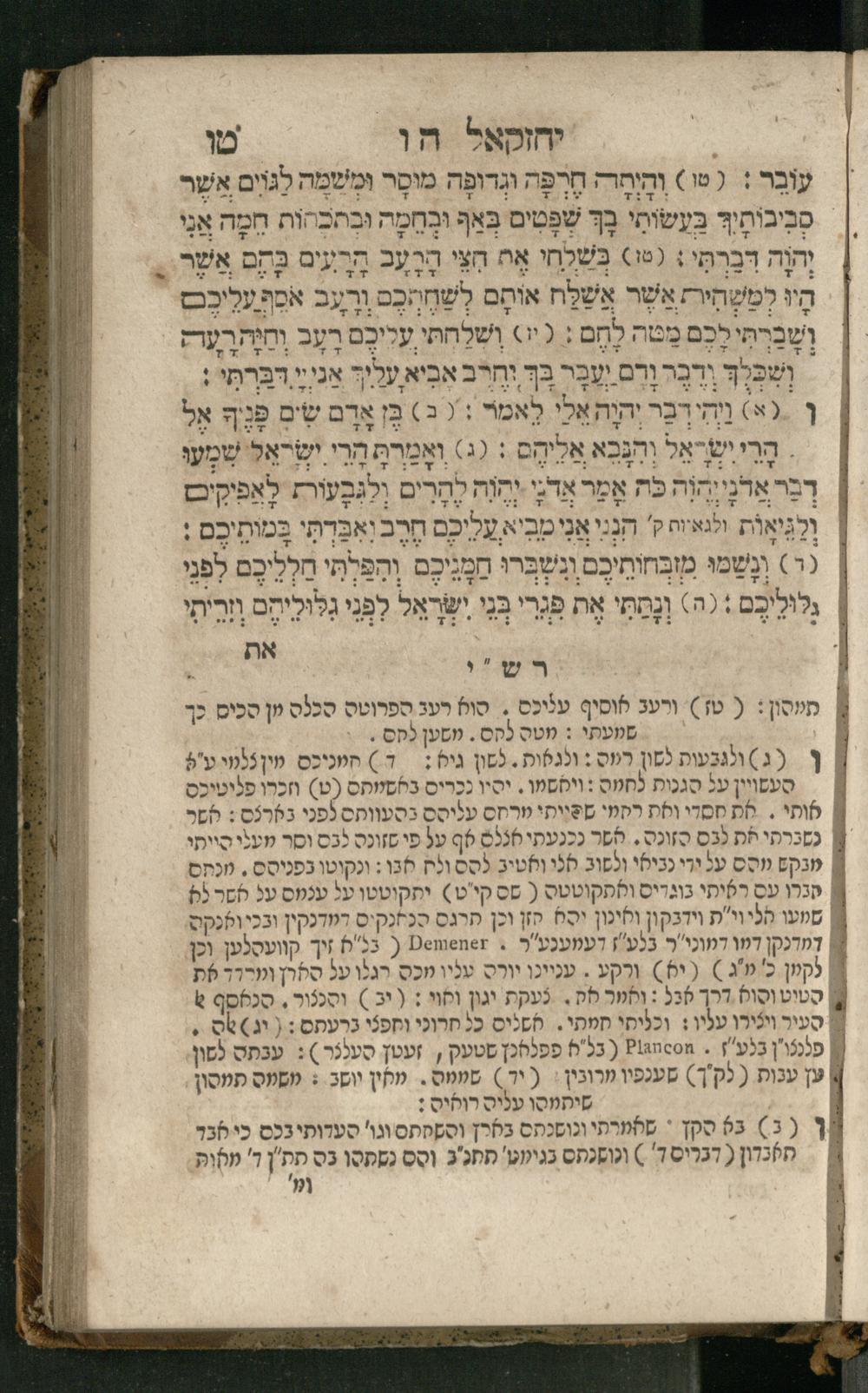 Ṿe-hu Sefer Yeḥezḳel / meturgam Ashkenazit u-mevoʾar, gam hitsagti bo perush ... Rashi z.ts.l. ... Ṿe-nilṿeh elaṿ perush Mikhlal yofi ...והוא ספר יחזקאל / מתורגם אשכנזית ומבואר, גם הצגתי בו פירוש ... רש״י זצ״ל ... ונלוה אליו פירוש מכלל יופי ...