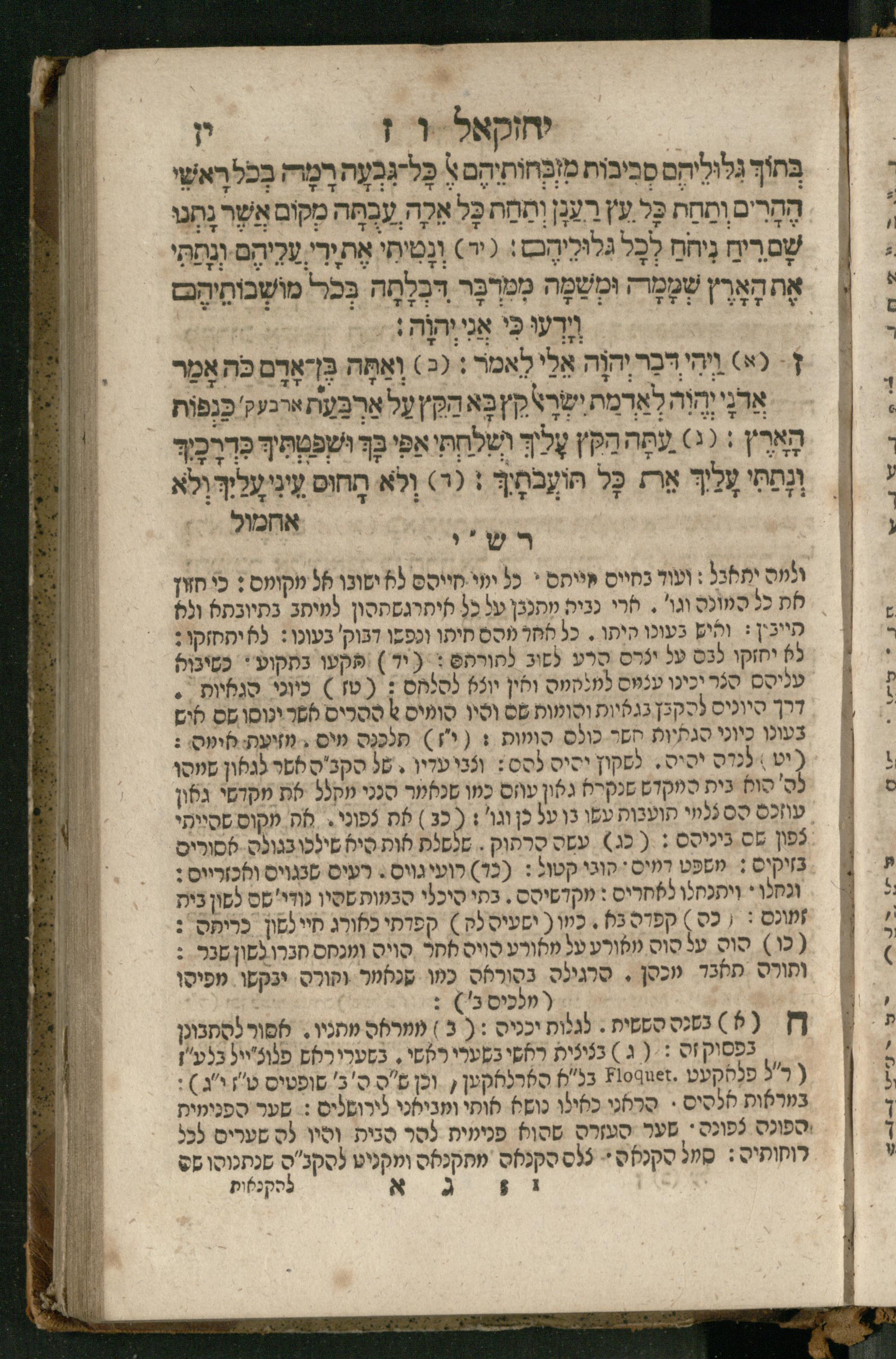 Ṿe-hu Sefer Yeḥezḳel / meturgam Ashkenazit u-mevoʾar, gam hitsagti bo perush ... Rashi z.ts.l. ... Ṿe-nilṿeh elaṿ perush Mikhlal yofi ...והוא ספר יחזקאל / מתורגם אשכנזית ומבואר, גם הצגתי בו פירוש ... רש״י זצ״ל ... ונלוה אליו פירוש מכלל יופי ...