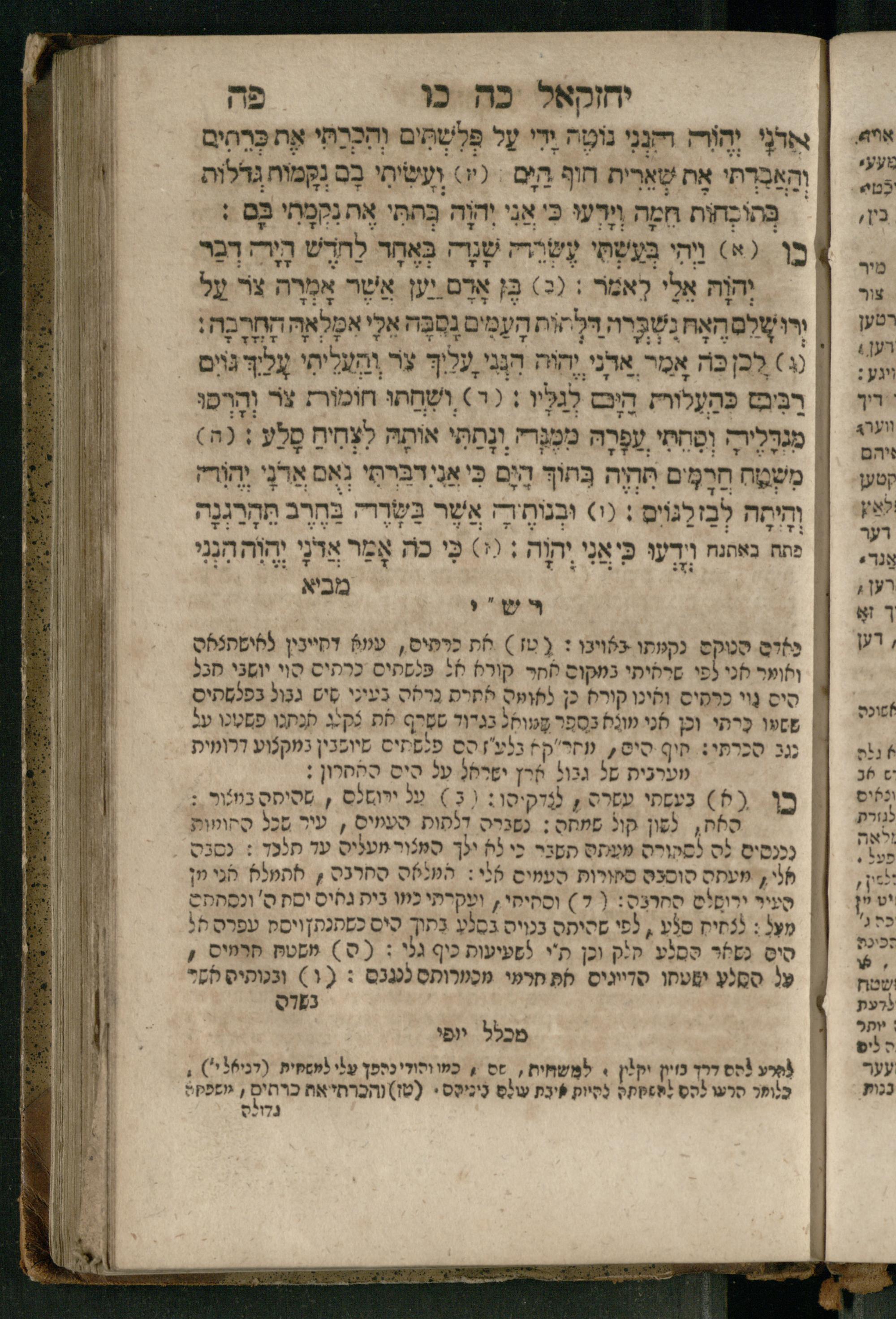 Ṿe-hu Sefer Yeḥezḳel / meturgam Ashkenazit u-mevoʾar, gam hitsagti bo perush ... Rashi z.ts.l. ... Ṿe-nilṿeh elaṿ perush Mikhlal yofi ...והוא ספר יחזקאל / מתורגם אשכנזית ומבואר, גם הצגתי בו פירוש ... רש״י זצ״ל ... ונלוה אליו פירוש מכלל יופי ...