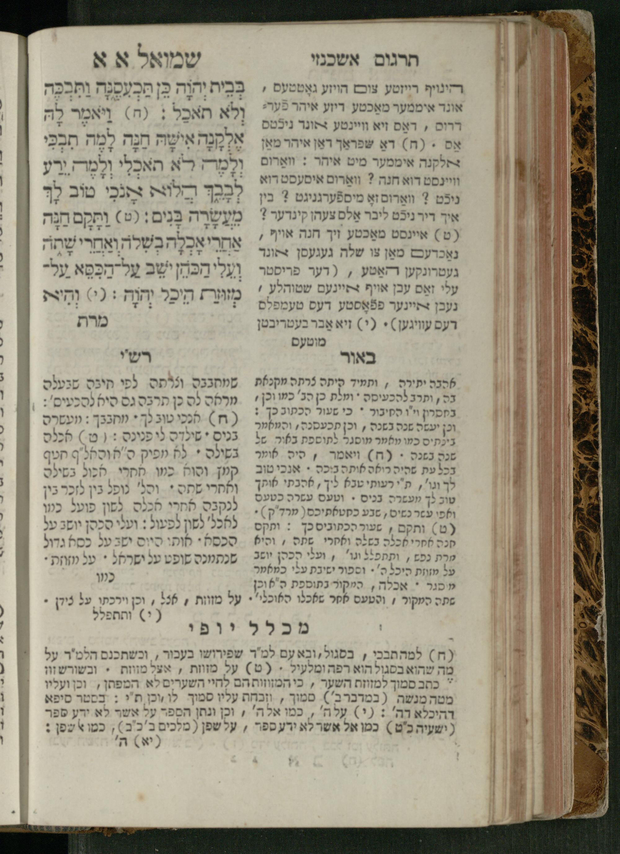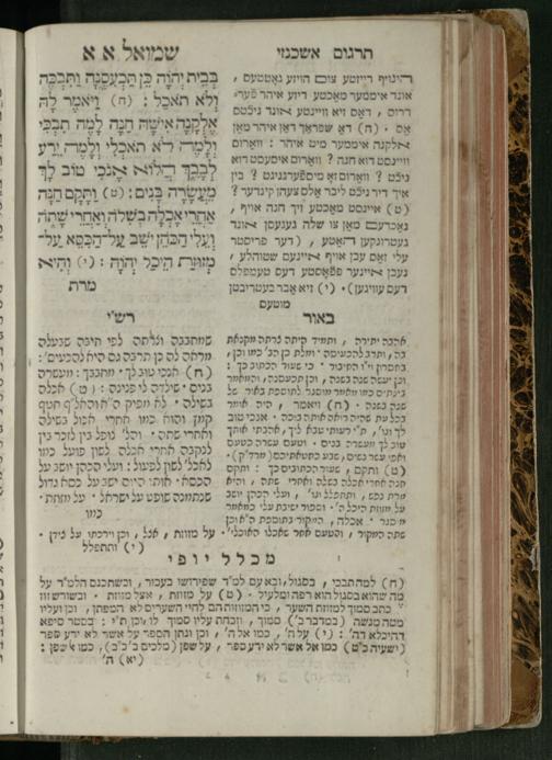 Sefer Shemuʾel 1 / ʿim targum Ashkenazi, u-veʾur, kemo she-nidpas be-Ṿin [meturgam u-mevoʾar ʿal-yede R. Meʾir Oborniḳ], ṿe-hosafti bo pe. ... Rashi z.ts.l. ... Ṿe-nilṿeh elaṿ, pe. Mikhlal yofi .. ṿe-gam Tokheḥat ḥayim mi-R.ʿA. Figo z.ts.l. ...ספר שמואל א / עם תרגום אשכנזי, ובאור, כמו שנדפס בווין [מתורגם ומבואר על ידי ר׳ מאיר אברניק], והוספתי בו פי׳ ... רש״י זצ״ל. ... ונלוה אליו, פי׳ מכלל יופי ... וגם תוכחת חיים, מר״ע פיגו זצ״ל