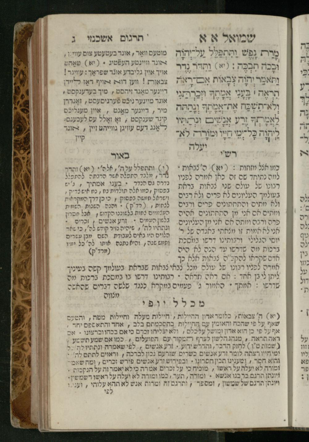 Sefer Shemuʾel 1 / ʿim targum Ashkenazi, u-veʾur, kemo she-nidpas be-Ṿin [meturgam u-mevoʾar ʿal-yede R. Meʾir Oborniḳ], ṿe-hosafti bo pe. ... Rashi z.ts.l. ... Ṿe-nilṿeh elaṿ, pe. Mikhlal yofi .. ṿe-gam Tokheḥat ḥayim mi-R.ʿA. Figo z.ts.l. ...ספר שמואל א / עם תרגום אשכנזי, ובאור, כמו שנדפס בווין [מתורגם ומבואר על ידי ר׳ מאיר אברניק], והוספתי בו פי׳ ... רש״י זצ״ל. ... ונלוה אליו, פי׳ מכלל יופי ... וגם תוכחת חיים, מר״ע פיגו זצ״ל