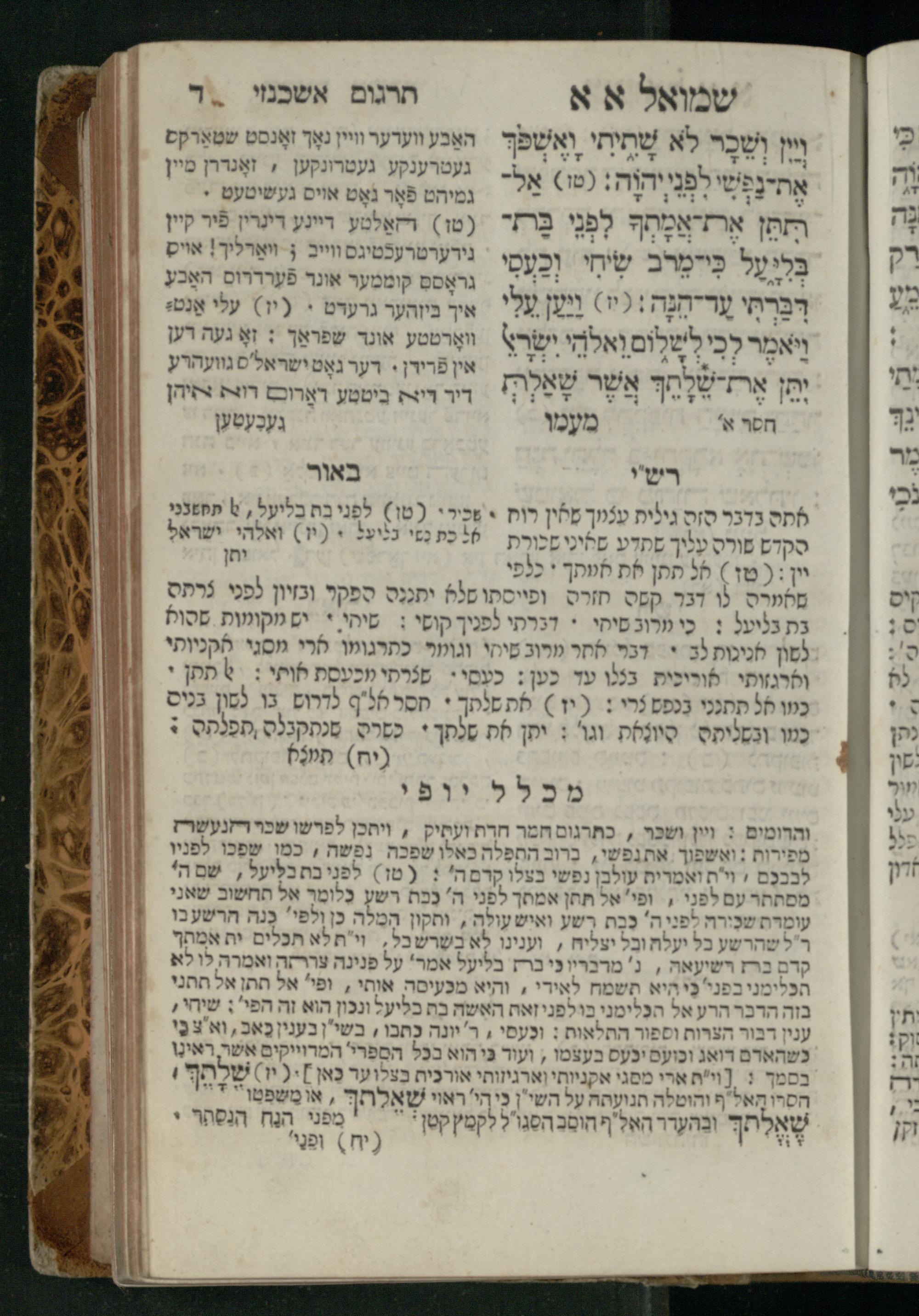 Sefer Shemuʾel 1 / ʿim targum Ashkenazi, u-veʾur, kemo she-nidpas be-Ṿin [meturgam u-mevoʾar ʿal-yede R. Meʾir Oborniḳ], ṿe-hosafti bo pe. ... Rashi z.ts.l. ... Ṿe-nilṿeh elaṿ, pe. Mikhlal yofi .. ṿe-gam Tokheḥat ḥayim mi-R.ʿA. Figo z.ts.l. ...ספר שמואל א / עם תרגום אשכנזי, ובאור, כמו שנדפס בווין [מתורגם ומבואר על ידי ר׳ מאיר אברניק], והוספתי בו פי׳ ... רש״י זצ״ל. ... ונלוה אליו, פי׳ מכלל יופי ... וגם תוכחת חיים, מר״ע פיגו זצ״ל