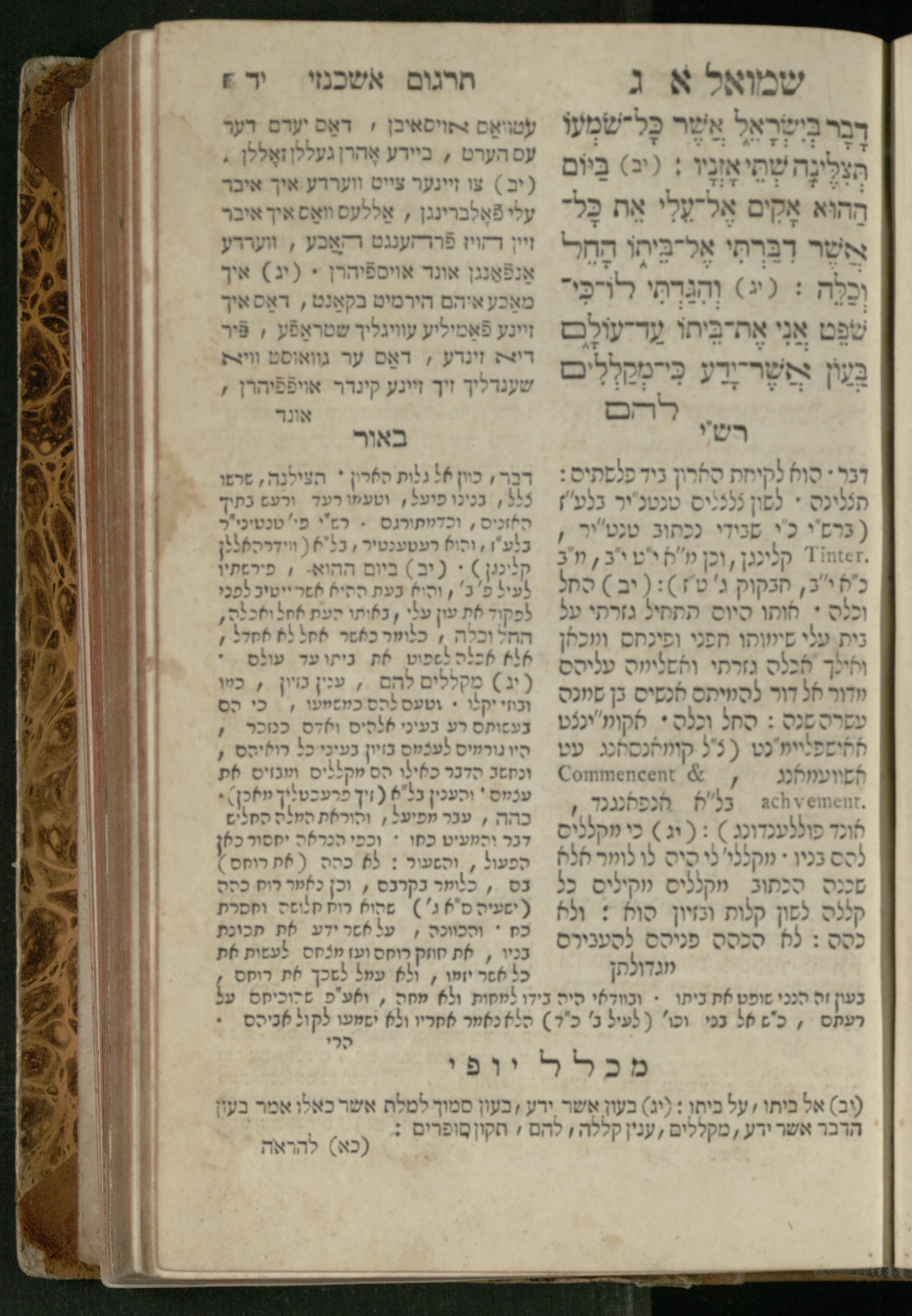 Sefer Shemuʾel 1 / ʿim targum Ashkenazi, u-veʾur, kemo she-nidpas be-Ṿin [meturgam u-mevoʾar ʿal-yede R. Meʾir Oborniḳ], ṿe-hosafti bo pe. ... Rashi z.ts.l. ... Ṿe-nilṿeh elaṿ, pe. Mikhlal yofi .. ṿe-gam Tokheḥat ḥayim mi-R.ʿA. Figo z.ts.l. ...ספר שמואל א / עם תרגום אשכנזי, ובאור, כמו שנדפס בווין [מתורגם ומבואר על ידי ר׳ מאיר אברניק], והוספתי בו פי׳ ... רש״י זצ״ל. ... ונלוה אליו, פי׳ מכלל יופי ... וגם תוכחת חיים, מר״ע פיגו זצ״ל