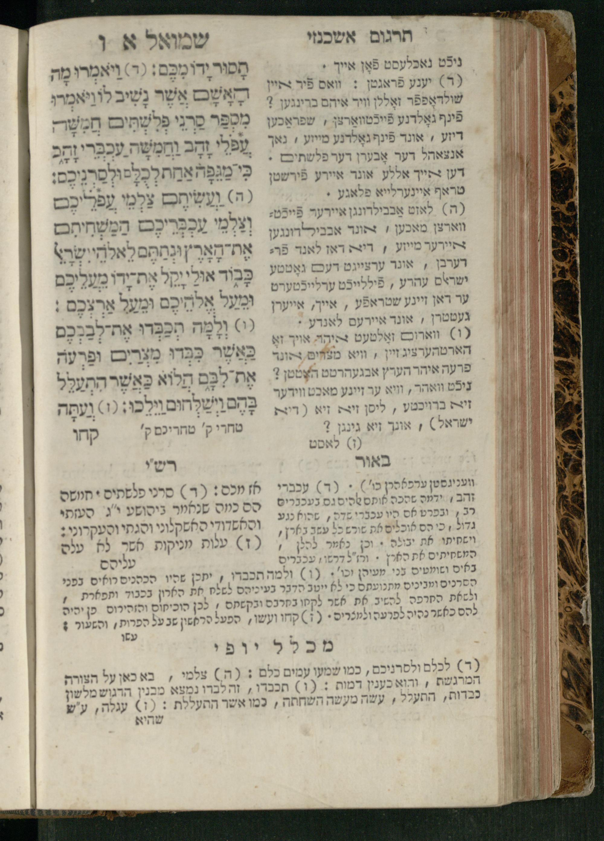 Sefer Shemuʾel 1 / ʿim targum Ashkenazi, u-veʾur, kemo she-nidpas be-Ṿin [meturgam u-mevoʾar ʿal-yede R. Meʾir Oborniḳ], ṿe-hosafti bo pe. ... Rashi z.ts.l. ... Ṿe-nilṿeh elaṿ, pe. Mikhlal yofi .. ṿe-gam Tokheḥat ḥayim mi-R.ʿA. Figo z.ts.l. ...ספר שמואל א / עם תרגום אשכנזי, ובאור, כמו שנדפס בווין [מתורגם ומבואר על ידי ר׳ מאיר אברניק], והוספתי בו פי׳ ... רש״י זצ״ל. ... ונלוה אליו, פי׳ מכלל יופי ... וגם תוכחת חיים, מר״ע פיגו זצ״ל