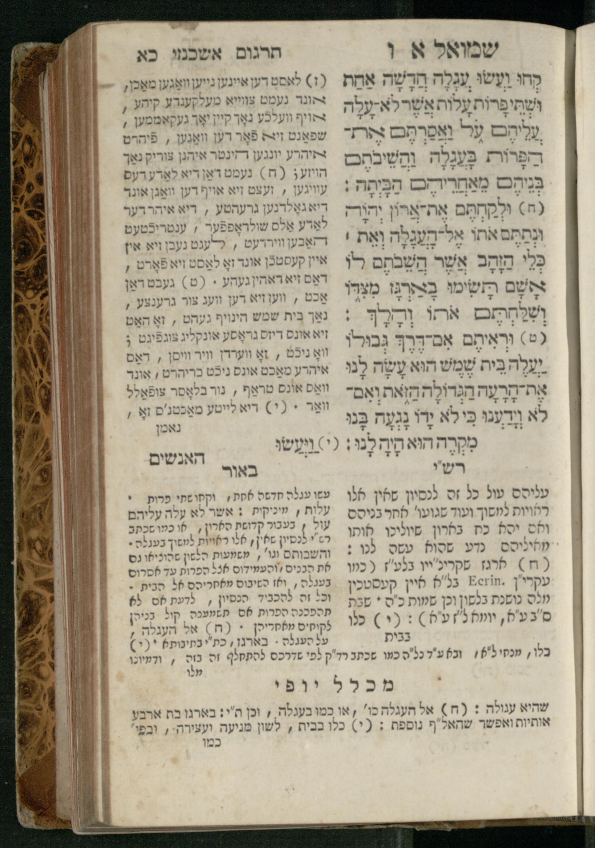 Sefer Shemuʾel 1 / ʿim targum Ashkenazi, u-veʾur, kemo she-nidpas be-Ṿin [meturgam u-mevoʾar ʿal-yede R. Meʾir Oborniḳ], ṿe-hosafti bo pe. ... Rashi z.ts.l. ... Ṿe-nilṿeh elaṿ, pe. Mikhlal yofi .. ṿe-gam Tokheḥat ḥayim mi-R.ʿA. Figo z.ts.l. ...ספר שמואל א / עם תרגום אשכנזי, ובאור, כמו שנדפס בווין [מתורגם ומבואר על ידי ר׳ מאיר אברניק], והוספתי בו פי׳ ... רש״י זצ״ל. ... ונלוה אליו, פי׳ מכלל יופי ... וגם תוכחת חיים, מר״ע פיגו זצ״ל