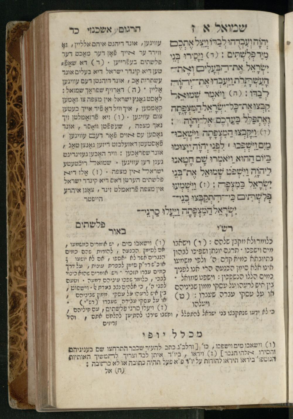 Sefer Shemuʾel 1 / ʿim targum Ashkenazi, u-veʾur, kemo she-nidpas be-Ṿin [meturgam u-mevoʾar ʿal-yede R. Meʾir Oborniḳ], ṿe-hosafti bo pe. ... Rashi z.ts.l. ... Ṿe-nilṿeh elaṿ, pe. Mikhlal yofi .. ṿe-gam Tokheḥat ḥayim mi-R.ʿA. Figo z.ts.l. ...ספר שמואל א / עם תרגום אשכנזי, ובאור, כמו שנדפס בווין [מתורגם ומבואר על ידי ר׳ מאיר אברניק], והוספתי בו פי׳ ... רש״י זצ״ל. ... ונלוה אליו, פי׳ מכלל יופי ... וגם תוכחת חיים, מר״ע פיגו זצ״ל
