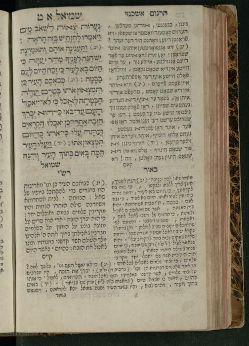 Sefer Shemuʾel 1 / ʿim targum Ashkenazi, u-veʾur, kemo she-nidpas be-Ṿin [meturgam u-mevoʾar ʿal-yede R. Meʾir Oborniḳ], ṿe-hosafti bo pe. ... Rashi z.ts.l. ... Ṿe-nilṿeh elaṿ, pe. Mikhlal yofi .. ṿe-gam Tokheḥat ḥayim mi-R.ʿA. Figo z.ts.l. ...ספר שמואל א / עם תרגום אשכנזי, ובאור, כמו שנדפס בווין [מתורגם ומבואר על ידי ר׳ מאיר אברניק], והוספתי בו פי׳ ... רש״י זצ״ל. ... ונלוה אליו, פי׳ מכלל יופי ... וגם תוכחת חיים, מר״ע פיגו זצ״ל