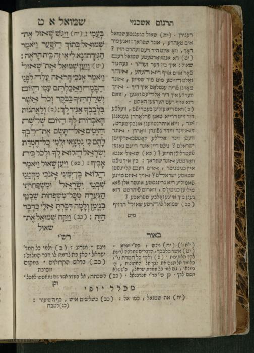 Sefer Shemuʾel 1 / ʿim targum Ashkenazi, u-veʾur, kemo she-nidpas be-Ṿin [meturgam u-mevoʾar ʿal-yede R. Meʾir Oborniḳ], ṿe-hosafti bo pe. ... Rashi z.ts.l. ... Ṿe-nilṿeh elaṿ, pe. Mikhlal yofi .. ṿe-gam Tokheḥat ḥayim mi-R.ʿA. Figo z.ts.l. ...ספר שמואל א / עם תרגום אשכנזי, ובאור, כמו שנדפס בווין [מתורגם ומבואר על ידי ר׳ מאיר אברניק], והוספתי בו פי׳ ... רש״י זצ״ל. ... ונלוה אליו, פי׳ מכלל יופי ... וגם תוכחת חיים, מר״ע פיגו זצ״ל
