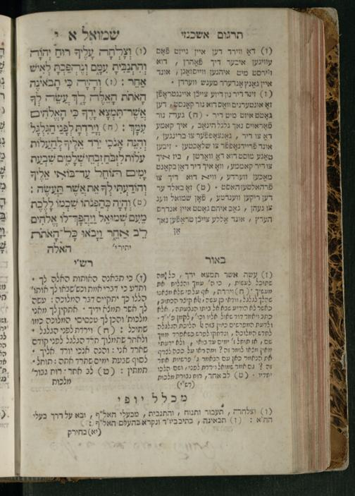 Sefer Shemuʾel 1 / ʿim targum Ashkenazi, u-veʾur, kemo she-nidpas be-Ṿin [meturgam u-mevoʾar ʿal-yede R. Meʾir Oborniḳ], ṿe-hosafti bo pe. ... Rashi z.ts.l. ... Ṿe-nilṿeh elaṿ, pe. Mikhlal yofi .. ṿe-gam Tokheḥat ḥayim mi-R.ʿA. Figo z.ts.l. ...ספר שמואל א / עם תרגום אשכנזי, ובאור, כמו שנדפס בווין [מתורגם ומבואר על ידי ר׳ מאיר אברניק], והוספתי בו פי׳ ... רש״י זצ״ל. ... ונלוה אליו, פי׳ מכלל יופי ... וגם תוכחת חיים, מר״ע פיגו זצ״ל