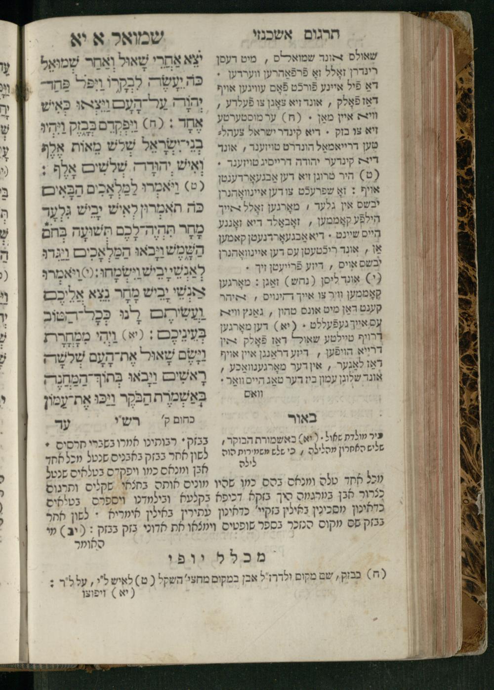 Sefer Shemuʾel 1 / ʿim targum Ashkenazi, u-veʾur, kemo she-nidpas be-Ṿin [meturgam u-mevoʾar ʿal-yede R. Meʾir Oborniḳ], ṿe-hosafti bo pe. ... Rashi z.ts.l. ... Ṿe-nilṿeh elaṿ, pe. Mikhlal yofi .. ṿe-gam Tokheḥat ḥayim mi-R.ʿA. Figo z.ts.l. ...ספר שמואל א / עם תרגום אשכנזי, ובאור, כמו שנדפס בווין [מתורגם ומבואר על ידי ר׳ מאיר אברניק], והוספתי בו פי׳ ... רש״י זצ״ל. ... ונלוה אליו, פי׳ מכלל יופי ... וגם תוכחת חיים, מר״ע פיגו זצ״ל