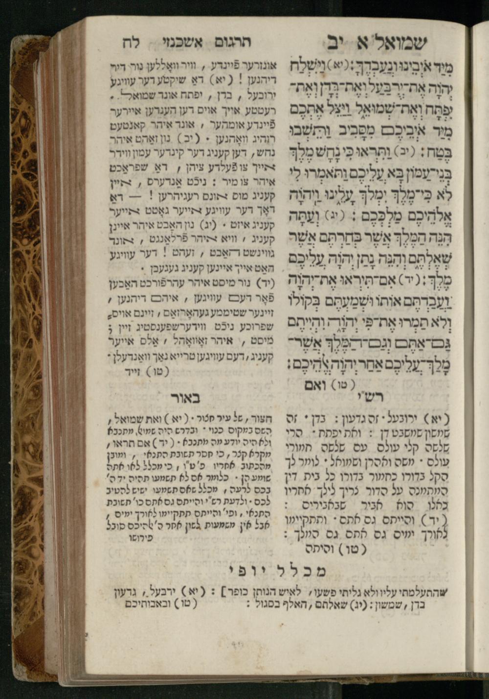 Sefer Shemuʾel 1 / ʿim targum Ashkenazi, u-veʾur, kemo she-nidpas be-Ṿin [meturgam u-mevoʾar ʿal-yede R. Meʾir Oborniḳ], ṿe-hosafti bo pe. ... Rashi z.ts.l. ... Ṿe-nilṿeh elaṿ, pe. Mikhlal yofi .. ṿe-gam Tokheḥat ḥayim mi-R.ʿA. Figo z.ts.l. ...ספר שמואל א / עם תרגום אשכנזי, ובאור, כמו שנדפס בווין [מתורגם ומבואר על ידי ר׳ מאיר אברניק], והוספתי בו פי׳ ... רש״י זצ״ל. ... ונלוה אליו, פי׳ מכלל יופי ... וגם תוכחת חיים, מר״ע פיגו זצ״ל