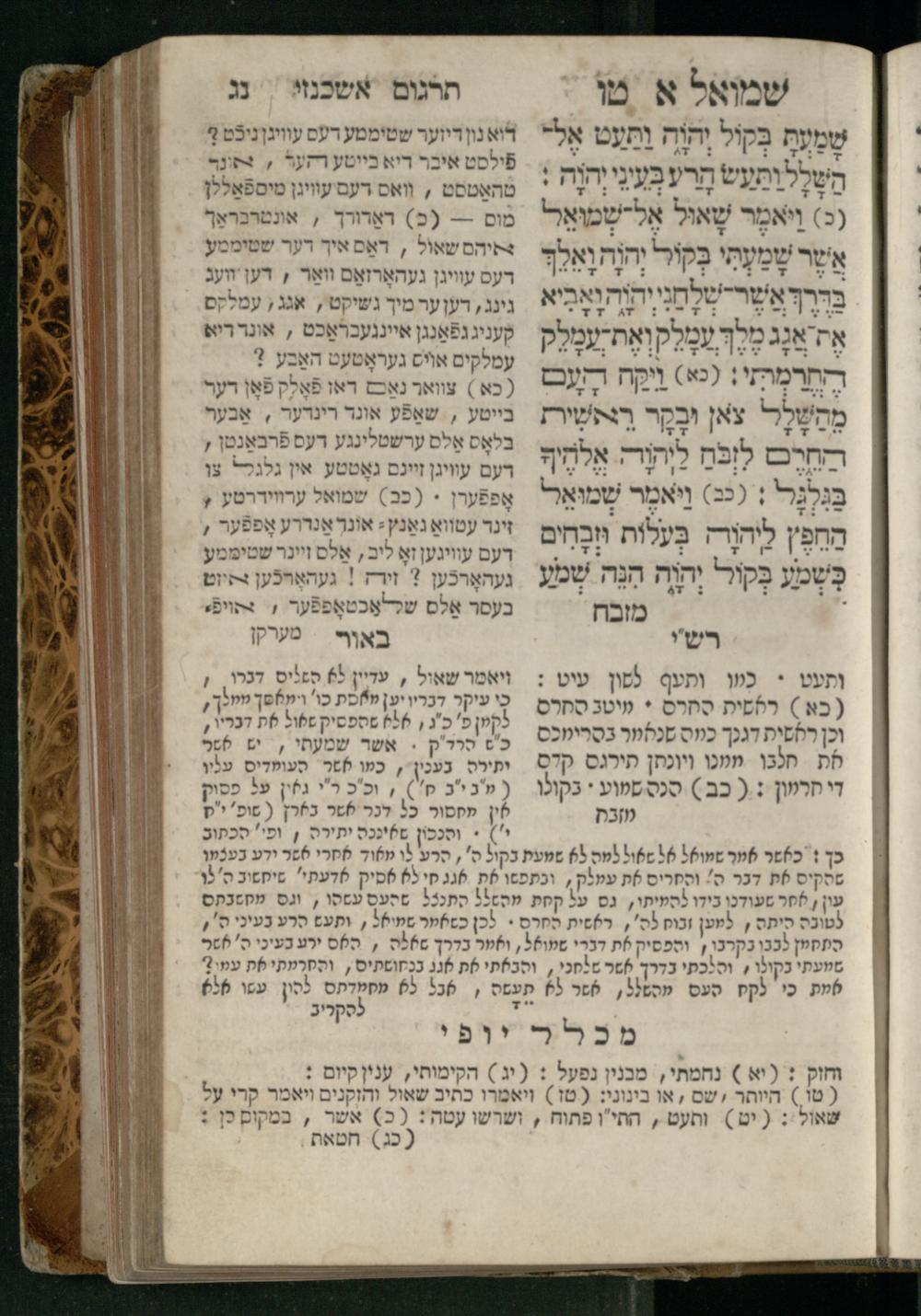 Sefer Shemuʾel 1 / ʿim targum Ashkenazi, u-veʾur, kemo she-nidpas be-Ṿin [meturgam u-mevoʾar ʿal-yede R. Meʾir Oborniḳ], ṿe-hosafti bo pe. ... Rashi z.ts.l. ... Ṿe-nilṿeh elaṿ, pe. Mikhlal yofi .. ṿe-gam Tokheḥat ḥayim mi-R.ʿA. Figo z.ts.l. ...ספר שמואל א / עם תרגום אשכנזי, ובאור, כמו שנדפס בווין [מתורגם ומבואר על ידי ר׳ מאיר אברניק], והוספתי בו פי׳ ... רש״י זצ״ל. ... ונלוה אליו, פי׳ מכלל יופי ... וגם תוכחת חיים, מר״ע פיגו זצ״ל