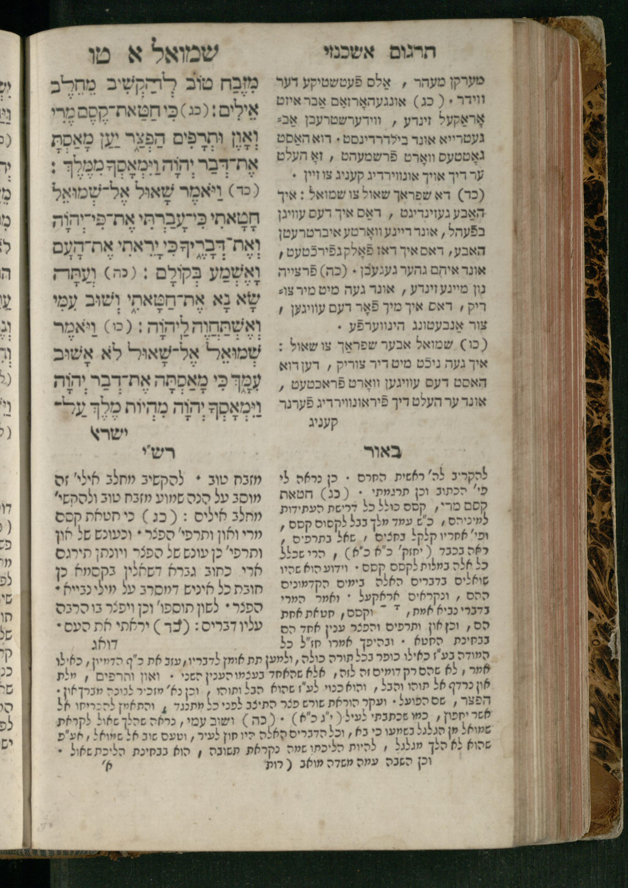 Sefer Shemuʾel 1 / ʿim targum Ashkenazi, u-veʾur, kemo she-nidpas be-Ṿin [meturgam u-mevoʾar ʿal-yede R. Meʾir Oborniḳ], ṿe-hosafti bo pe. ... Rashi z.ts.l. ... Ṿe-nilṿeh elaṿ, pe. Mikhlal yofi .. ṿe-gam Tokheḥat ḥayim mi-R.ʿA. Figo z.ts.l. ...ספר שמואל א / עם תרגום אשכנזי, ובאור, כמו שנדפס בווין [מתורגם ומבואר על ידי ר׳ מאיר אברניק], והוספתי בו פי׳ ... רש״י זצ״ל. ... ונלוה אליו, פי׳ מכלל יופי ... וגם תוכחת חיים, מר״ע פיגו זצ״ל
