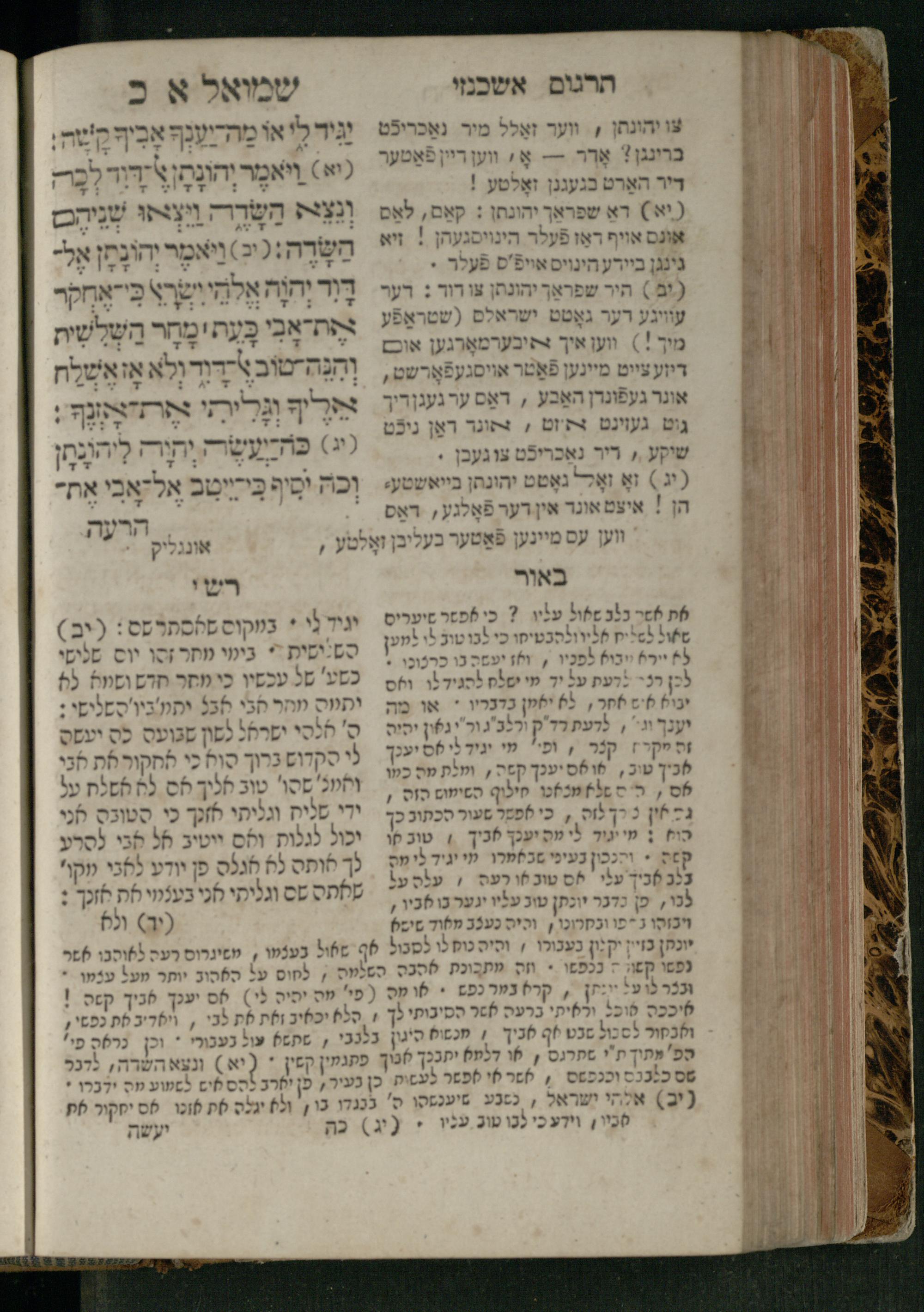 Sefer Shemuʾel 1 / ʿim targum Ashkenazi, u-veʾur, kemo she-nidpas be-Ṿin [meturgam u-mevoʾar ʿal-yede R. Meʾir Oborniḳ], ṿe-hosafti bo pe. ... Rashi z.ts.l. ... Ṿe-nilṿeh elaṿ, pe. Mikhlal yofi .. ṿe-gam Tokheḥat ḥayim mi-R.ʿA. Figo z.ts.l. ...ספר שמואל א / עם תרגום אשכנזי, ובאור, כמו שנדפס בווין [מתורגם ומבואר על ידי ר׳ מאיר אברניק], והוספתי בו פי׳ ... רש״י זצ״ל. ... ונלוה אליו, פי׳ מכלל יופי ... וגם תוכחת חיים, מר״ע פיגו זצ״ל