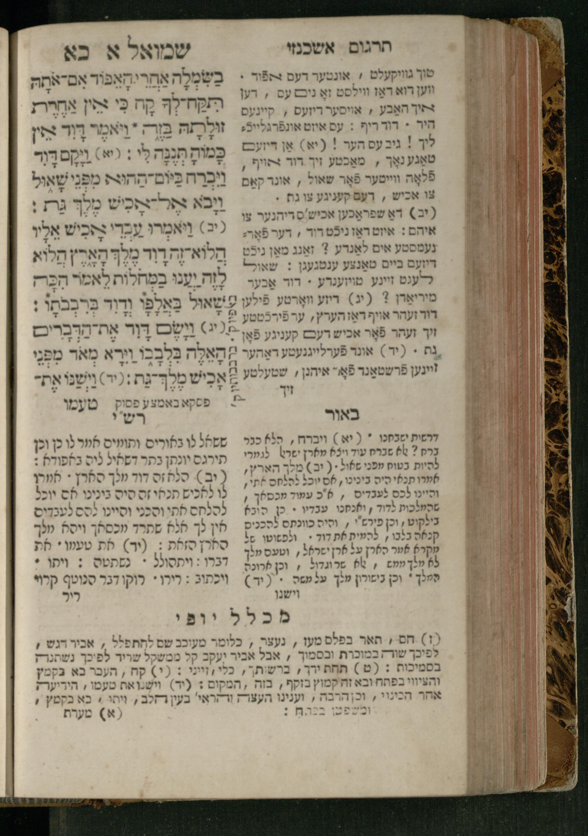 Sefer Shemuʾel 1 / ʿim targum Ashkenazi, u-veʾur, kemo she-nidpas be-Ṿin [meturgam u-mevoʾar ʿal-yede R. Meʾir Oborniḳ], ṿe-hosafti bo pe. ... Rashi z.ts.l. ... Ṿe-nilṿeh elaṿ, pe. Mikhlal yofi .. ṿe-gam Tokheḥat ḥayim mi-R.ʿA. Figo z.ts.l. ...ספר שמואל א / עם תרגום אשכנזי, ובאור, כמו שנדפס בווין [מתורגם ומבואר על ידי ר׳ מאיר אברניק], והוספתי בו פי׳ ... רש״י זצ״ל. ... ונלוה אליו, פי׳ מכלל יופי ... וגם תוכחת חיים, מר״ע פיגו זצ״ל