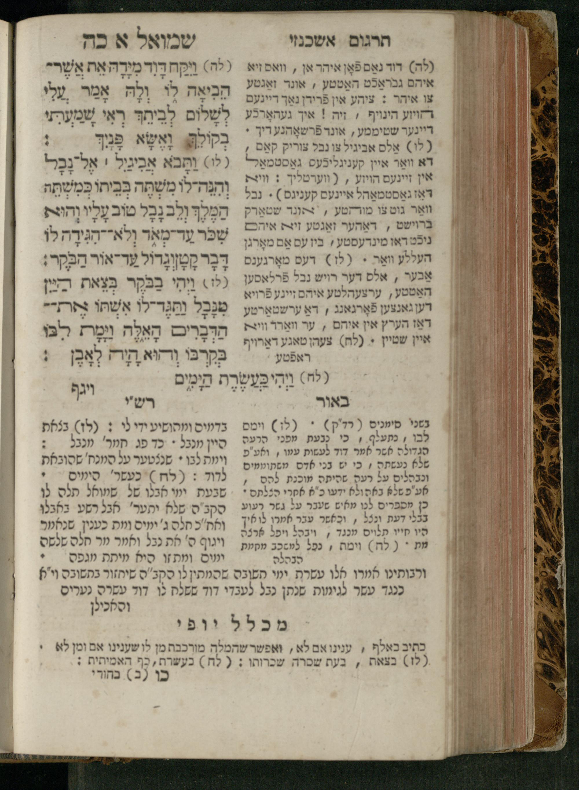 Sefer Shemuʾel 1 / ʿim targum Ashkenazi, u-veʾur, kemo she-nidpas be-Ṿin [meturgam u-mevoʾar ʿal-yede R. Meʾir Oborniḳ], ṿe-hosafti bo pe. ... Rashi z.ts.l. ... Ṿe-nilṿeh elaṿ, pe. Mikhlal yofi .. ṿe-gam Tokheḥat ḥayim mi-R.ʿA. Figo z.ts.l. ...ספר שמואל א / עם תרגום אשכנזי, ובאור, כמו שנדפס בווין [מתורגם ומבואר על ידי ר׳ מאיר אברניק], והוספתי בו פי׳ ... רש״י זצ״ל. ... ונלוה אליו, פי׳ מכלל יופי ... וגם תוכחת חיים, מר״ע פיגו זצ״ל