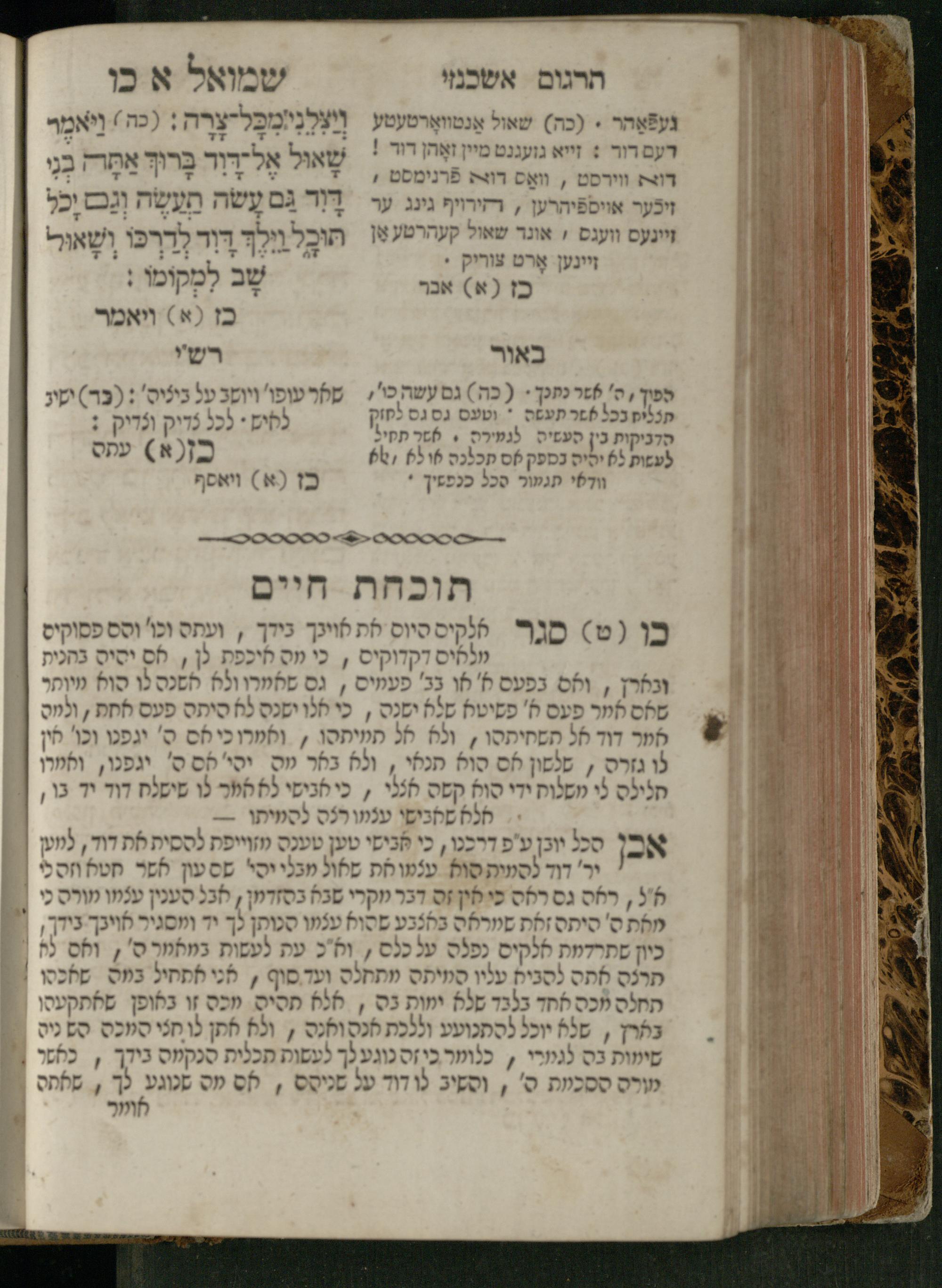 Sefer Shemuʾel 1 / ʿim targum Ashkenazi, u-veʾur, kemo she-nidpas be-Ṿin [meturgam u-mevoʾar ʿal-yede R. Meʾir Oborniḳ], ṿe-hosafti bo pe. ... Rashi z.ts.l. ... Ṿe-nilṿeh elaṿ, pe. Mikhlal yofi .. ṿe-gam Tokheḥat ḥayim mi-R.ʿA. Figo z.ts.l. ...ספר שמואל א / עם תרגום אשכנזי, ובאור, כמו שנדפס בווין [מתורגם ומבואר על ידי ר׳ מאיר אברניק], והוספתי בו פי׳ ... רש״י זצ״ל. ... ונלוה אליו, פי׳ מכלל יופי ... וגם תוכחת חיים, מר״ע פיגו זצ״ל