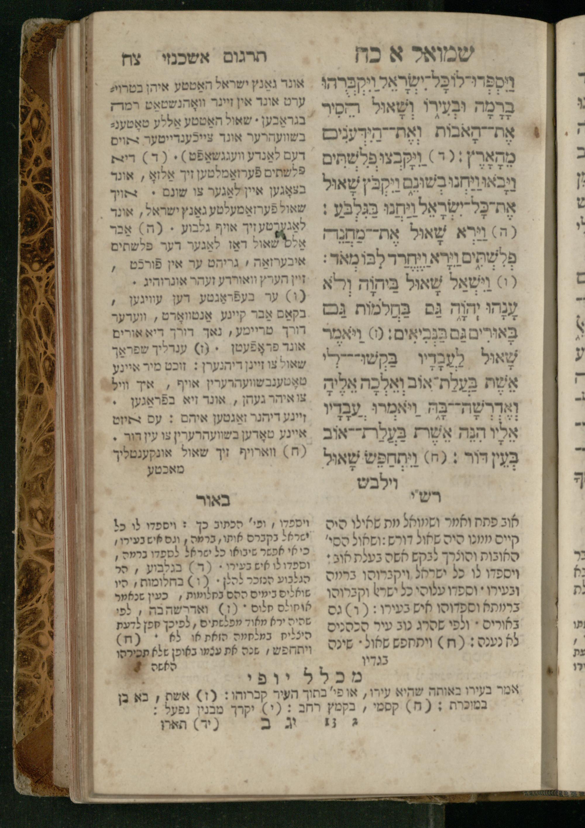 Sefer Shemuʾel 1 / ʿim targum Ashkenazi, u-veʾur, kemo she-nidpas be-Ṿin [meturgam u-mevoʾar ʿal-yede R. Meʾir Oborniḳ], ṿe-hosafti bo pe. ... Rashi z.ts.l. ... Ṿe-nilṿeh elaṿ, pe. Mikhlal yofi .. ṿe-gam Tokheḥat ḥayim mi-R.ʿA. Figo z.ts.l. ...ספר שמואל א / עם תרגום אשכנזי, ובאור, כמו שנדפס בווין [מתורגם ומבואר על ידי ר׳ מאיר אברניק], והוספתי בו פי׳ ... רש״י זצ״ל. ... ונלוה אליו, פי׳ מכלל יופי ... וגם תוכחת חיים, מר״ע פיגו זצ״ל