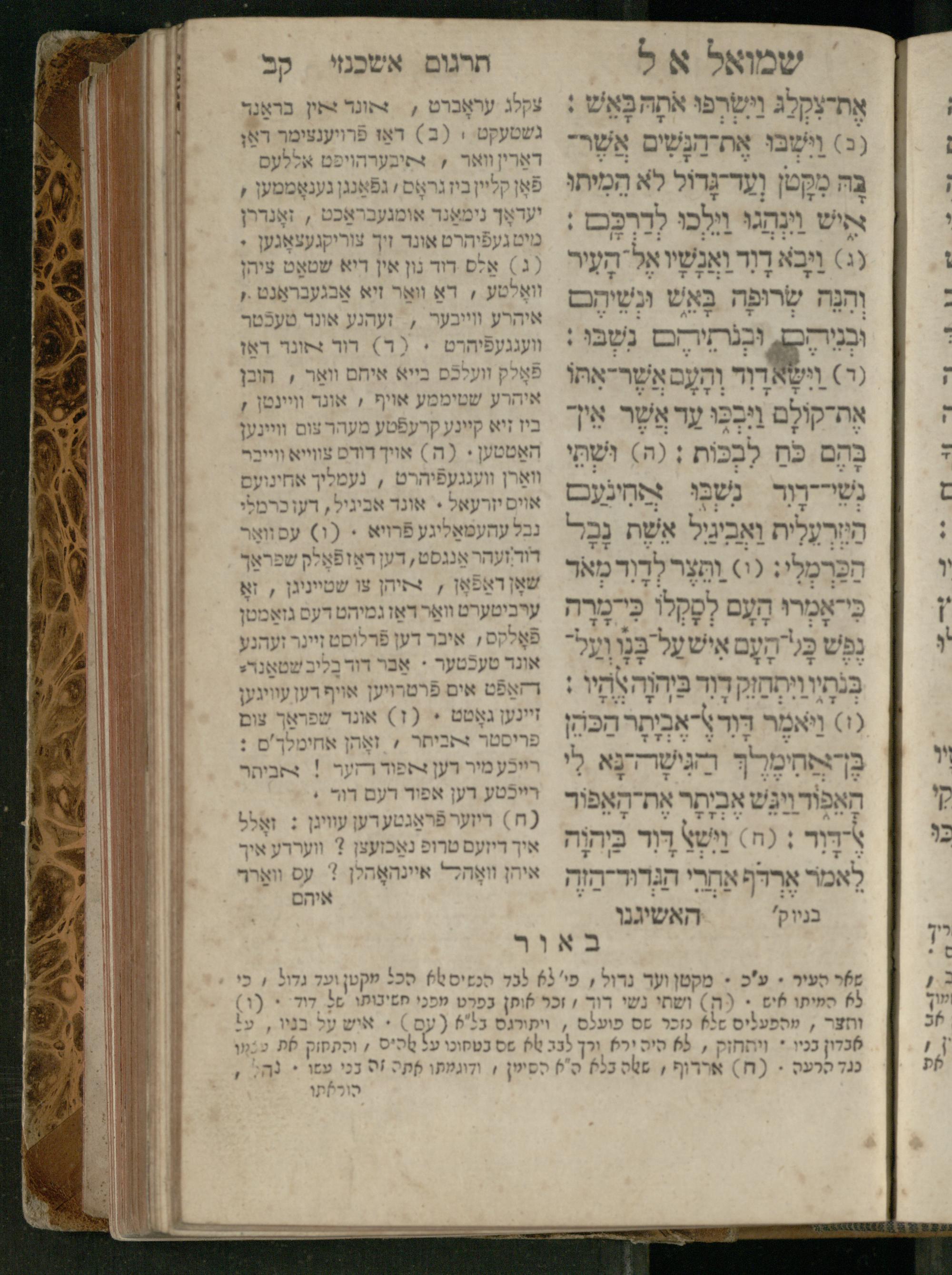 Sefer Shemuʾel 1 / ʿim targum Ashkenazi, u-veʾur, kemo she-nidpas be-Ṿin [meturgam u-mevoʾar ʿal-yede R. Meʾir Oborniḳ], ṿe-hosafti bo pe. ... Rashi z.ts.l. ... Ṿe-nilṿeh elaṿ, pe. Mikhlal yofi .. ṿe-gam Tokheḥat ḥayim mi-R.ʿA. Figo z.ts.l. ...ספר שמואל א / עם תרגום אשכנזי, ובאור, כמו שנדפס בווין [מתורגם ומבואר על ידי ר׳ מאיר אברניק], והוספתי בו פי׳ ... רש״י זצ״ל. ... ונלוה אליו, פי׳ מכלל יופי ... וגם תוכחת חיים, מר״ע פיגו זצ״ל