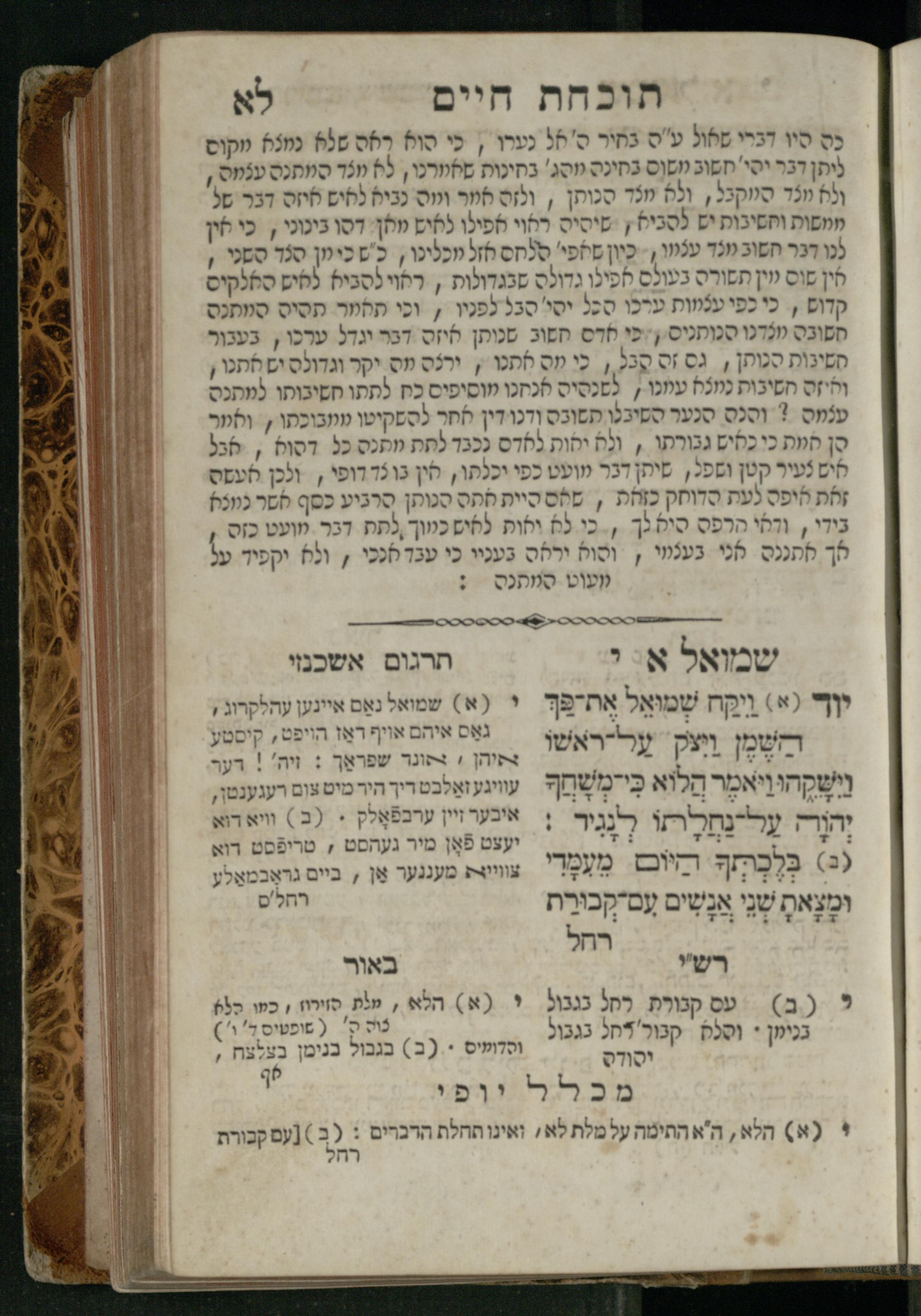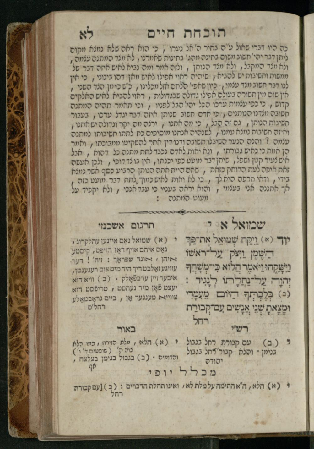 Sefer Shemuʾel 1 / ʿim targum Ashkenazi, u-veʾur, kemo she-nidpas be-Ṿin [meturgam u-mevoʾar ʿal-yede R. Meʾir Oborniḳ], ṿe-hosafti bo pe. ... Rashi z.ts.l. ... Ṿe-nilṿeh elaṿ, pe. Mikhlal yofi .. ṿe-gam Tokheḥat ḥayim mi-R.ʿA. Figo z.ts.l. ...ספר שמואל א / עם תרגום אשכנזי, ובאור, כמו שנדפס בווין [מתורגם ומבואר על ידי ר׳ מאיר אברניק], והוספתי בו פי׳ ... רש״י זצ״ל. ... ונלוה אליו, פי׳ מכלל יופי ... וגם תוכחת חיים, מר״ע פיגו זצ״ל