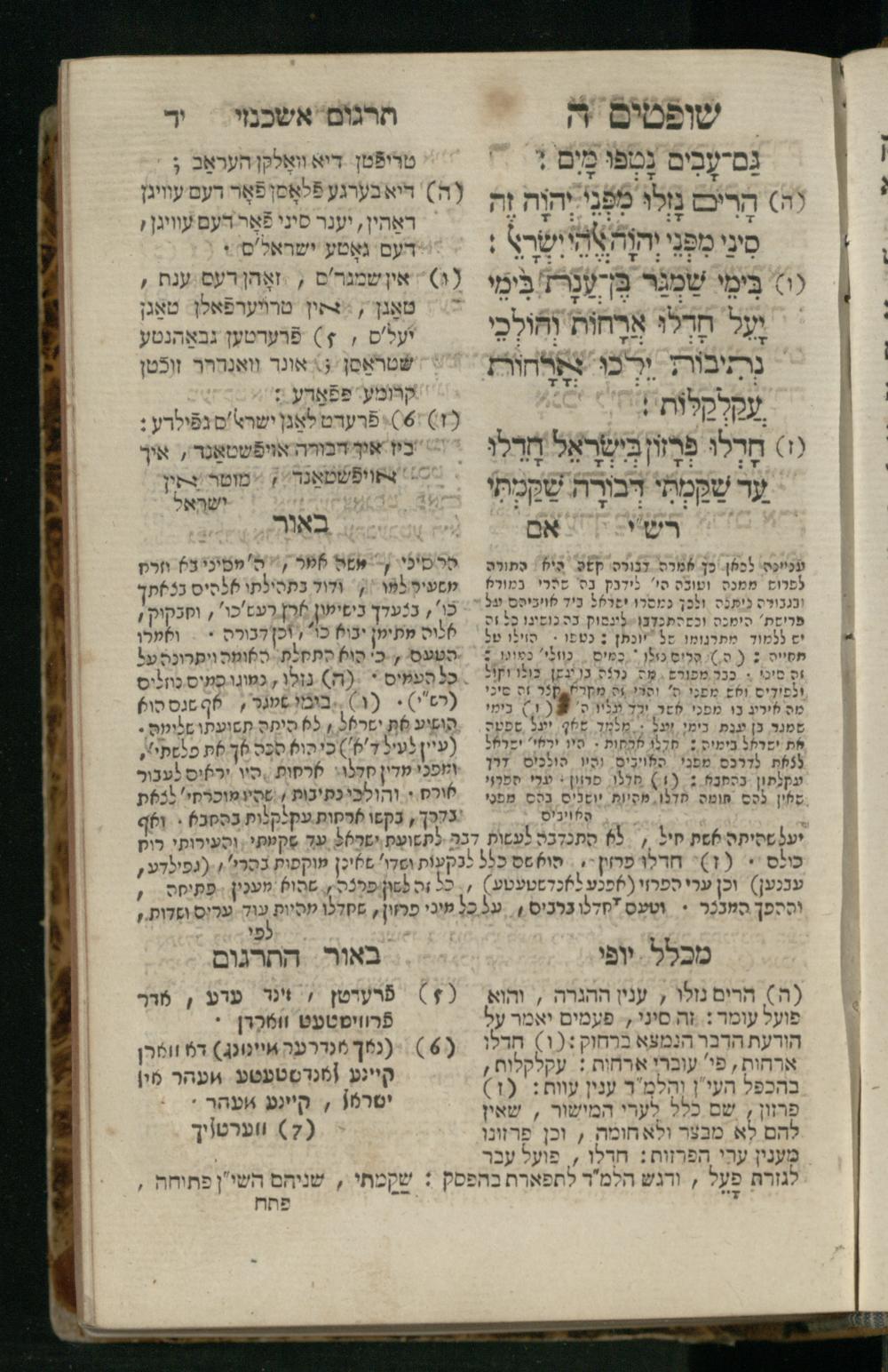 Sefer Shofṭim / ʿim targum Ashkenazi, u-veʾur, meturgam u-mevoʾar me-et R. Meʾir Oborniḳ, ṿe-hosafti bo pe. ... Rashi z.ts.l., ṿe-gam be-khol maḳom she-neʿemar be-perusho milat b.l.ʿa.z., ba be-tsedo ... perusho b.l.A. Ṿe-nilṿeh elaṿ pe. Mikhlal yofi ... ...ספר שופטים / עם תרגום אשכנזי, ובאור, מתורגם ומבואר מאת ר׳ מאיר אברניק, והוספתי בו פי׳... רש״י זצ״ל, וגם בכל מקום שנאמר בפירושו מלת בלע״ז, בא בצידו ... פירושו בל״א. ונלוה אליו פי׳ מכלל יופי ... ...