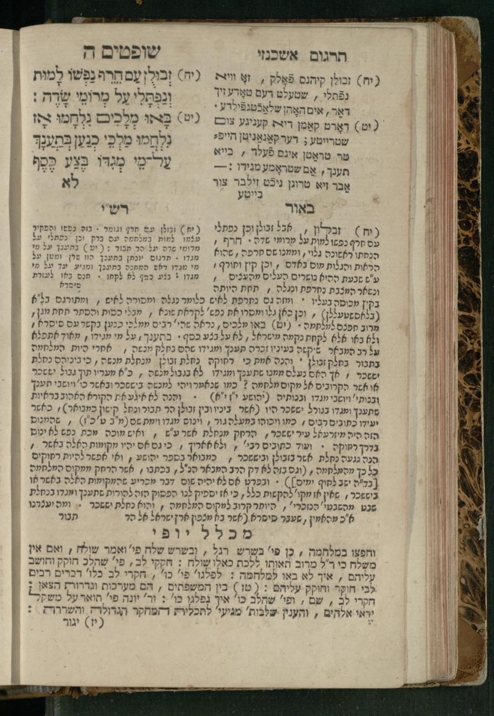 Sefer Shofṭim / ʿim targum Ashkenazi, u-veʾur, meturgam u-mevoʾar me-et R. Meʾir Oborniḳ, ṿe-hosafti bo pe. ... Rashi z.ts.l., ṿe-gam be-khol maḳom she-neʿemar be-perusho milat b.l.ʿa.z., ba be-tsedo ... perusho b.l.A. Ṿe-nilṿeh elaṿ pe. Mikhlal yofi ... ...ספר שופטים / עם תרגום אשכנזי, ובאור, מתורגם ומבואר מאת ר׳ מאיר אברניק, והוספתי בו פי׳... רש״י זצ״ל, וגם בכל מקום שנאמר בפירושו מלת בלע״ז, בא בצידו ... פירושו בל״א. ונלוה אליו פי׳ מכלל יופי ... ...