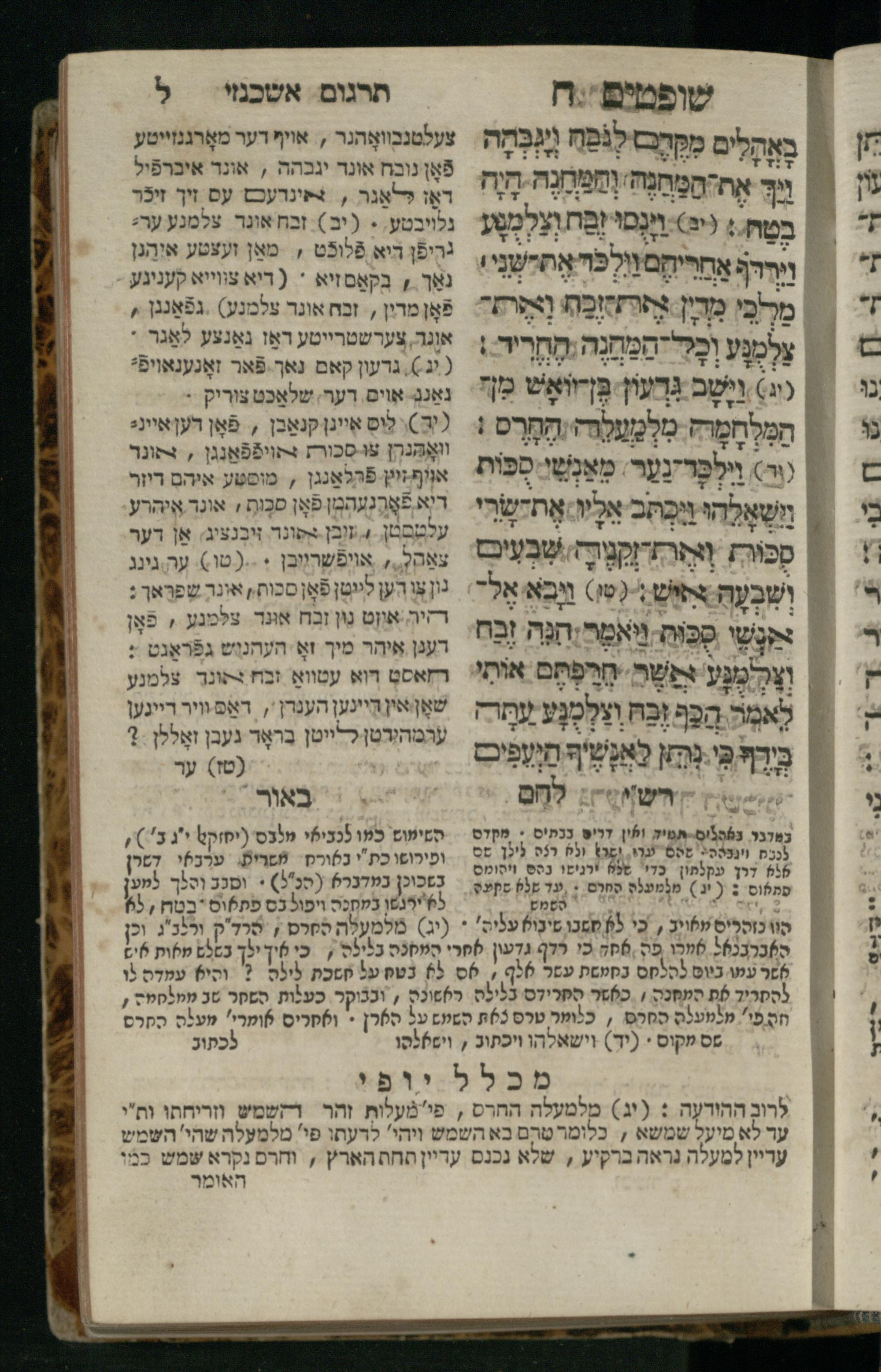 Sefer Shofṭim / ʿim targum Ashkenazi, u-veʾur, meturgam u-mevoʾar me-et R. Meʾir Oborniḳ, ṿe-hosafti bo pe. ... Rashi z.ts.l., ṿe-gam be-khol maḳom she-neʿemar be-perusho milat b.l.ʿa.z., ba be-tsedo ... perusho b.l.A. Ṿe-nilṿeh elaṿ pe. Mikhlal yofi ... ...ספר שופטים / עם תרגום אשכנזי, ובאור, מתורגם ומבואר מאת ר׳ מאיר אברניק, והוספתי בו פי׳... רש״י זצ״ל, וגם בכל מקום שנאמר בפירושו מלת בלע״ז, בא בצידו ... פירושו בל״א. ונלוה אליו פי׳ מכלל יופי ... ...
