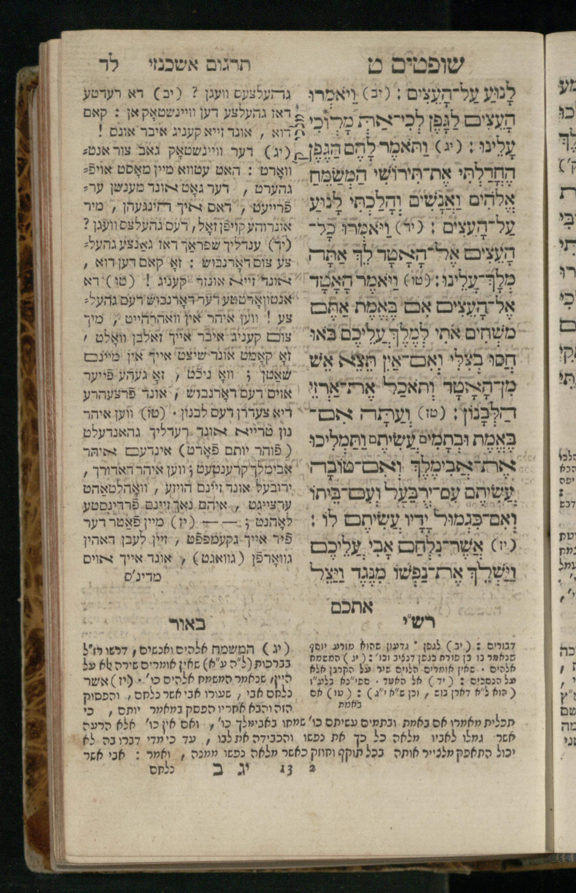 Sefer Shofṭim / ʿim targum Ashkenazi, u-veʾur, meturgam u-mevoʾar me-et R. Meʾir Oborniḳ, ṿe-hosafti bo pe. ... Rashi z.ts.l., ṿe-gam be-khol maḳom she-neʿemar be-perusho milat b.l.ʿa.z., ba be-tsedo ... perusho b.l.A. Ṿe-nilṿeh elaṿ pe. Mikhlal yofi ... ...ספר שופטים / עם תרגום אשכנזי, ובאור, מתורגם ומבואר מאת ר׳ מאיר אברניק, והוספתי בו פי׳... רש״י זצ״ל, וגם בכל מקום שנאמר בפירושו מלת בלע״ז, בא בצידו ... פירושו בל״א. ונלוה אליו פי׳ מכלל יופי ... ...