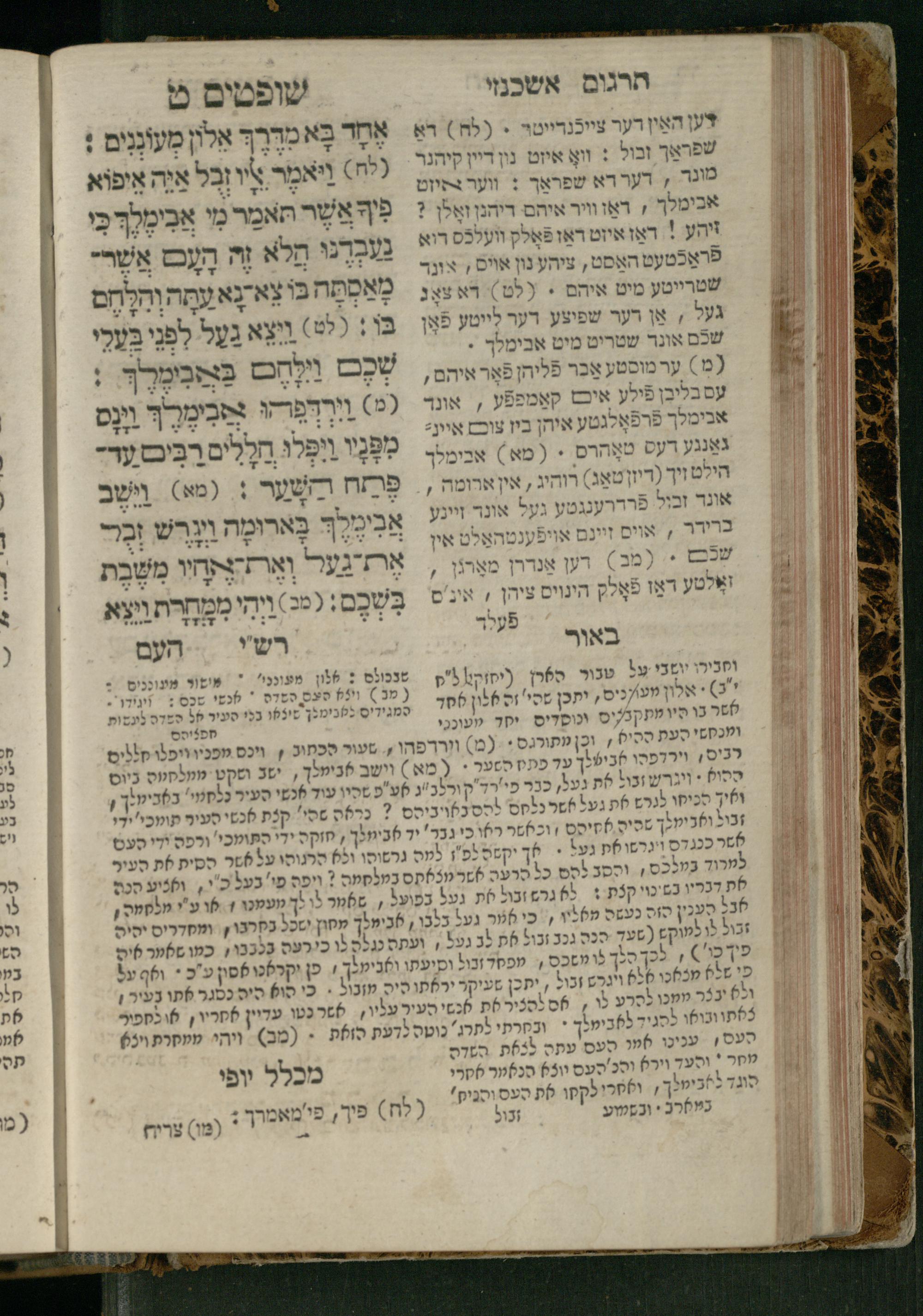 Sefer Shofṭim / ʿim targum Ashkenazi, u-veʾur, meturgam u-mevoʾar me-et R. Meʾir Oborniḳ, ṿe-hosafti bo pe. ... Rashi z.ts.l., ṿe-gam be-khol maḳom she-neʿemar be-perusho milat b.l.ʿa.z., ba be-tsedo ... perusho b.l.A. Ṿe-nilṿeh elaṿ pe. Mikhlal yofi ... ...ספר שופטים / עם תרגום אשכנזי, ובאור, מתורגם ומבואר מאת ר׳ מאיר אברניק, והוספתי בו פי׳... רש״י זצ״ל, וגם בכל מקום שנאמר בפירושו מלת בלע״ז, בא בצידו ... פירושו בל״א. ונלוה אליו פי׳ מכלל יופי ... ...